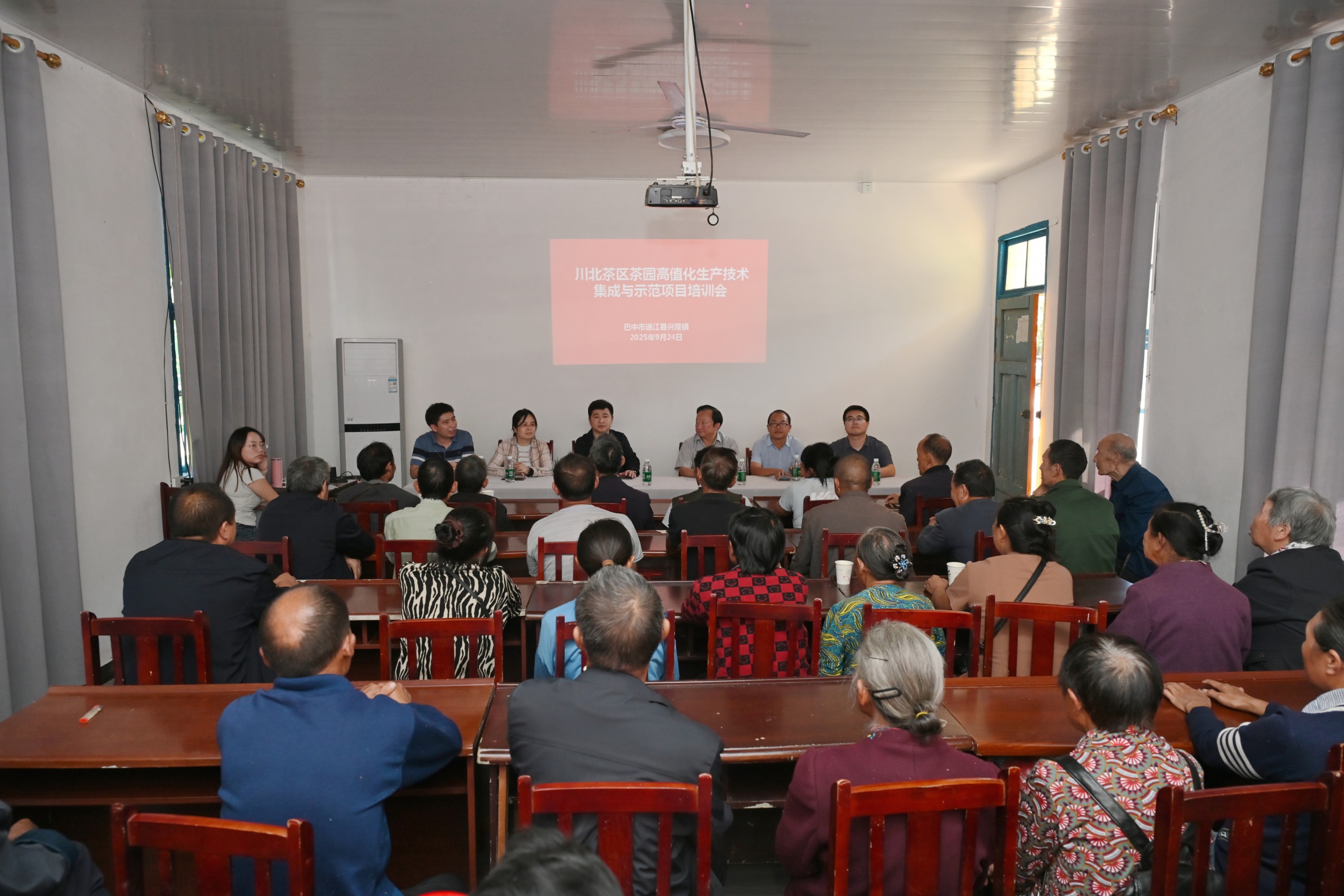 为有效推进2025年院中试熟化项目“川北茶区茶园高值化生产技术集成与示范”的落地执行,促进科研成果在产区的快速转化与应用,9月24日,项目负责人、茶叶所加工中心主任刘飞副研究员带领专家组一行四人,前往巴中市通江县产茶大镇—兴隆镇,开展茶叶生产技术专题培训。巴中市通江县茶叶产业发展中心、通江县教育科技局等相关单位负责人,以及通江县兴隆镇的茶企代表、专业合作社骨干和种植大户等一线管理与技术人员共计50余人参加。