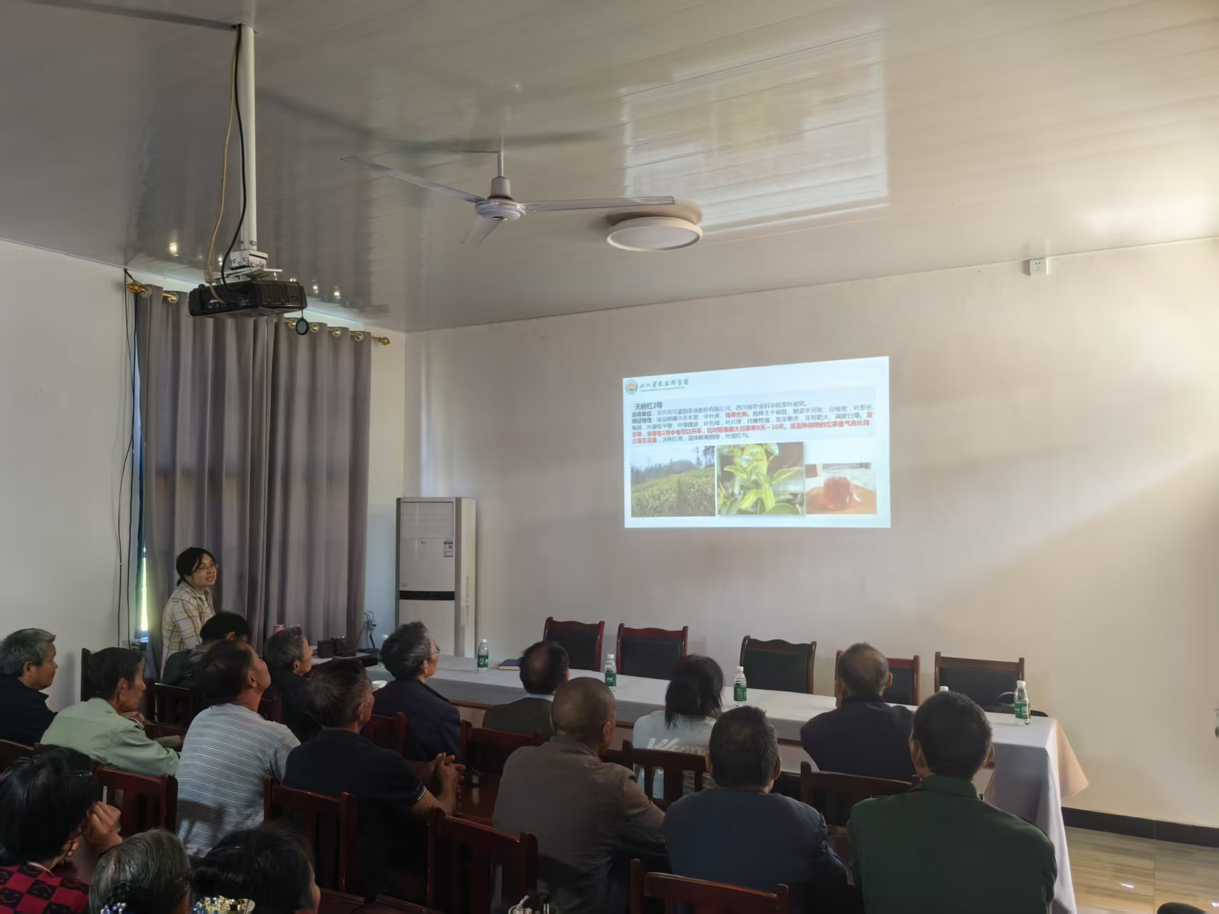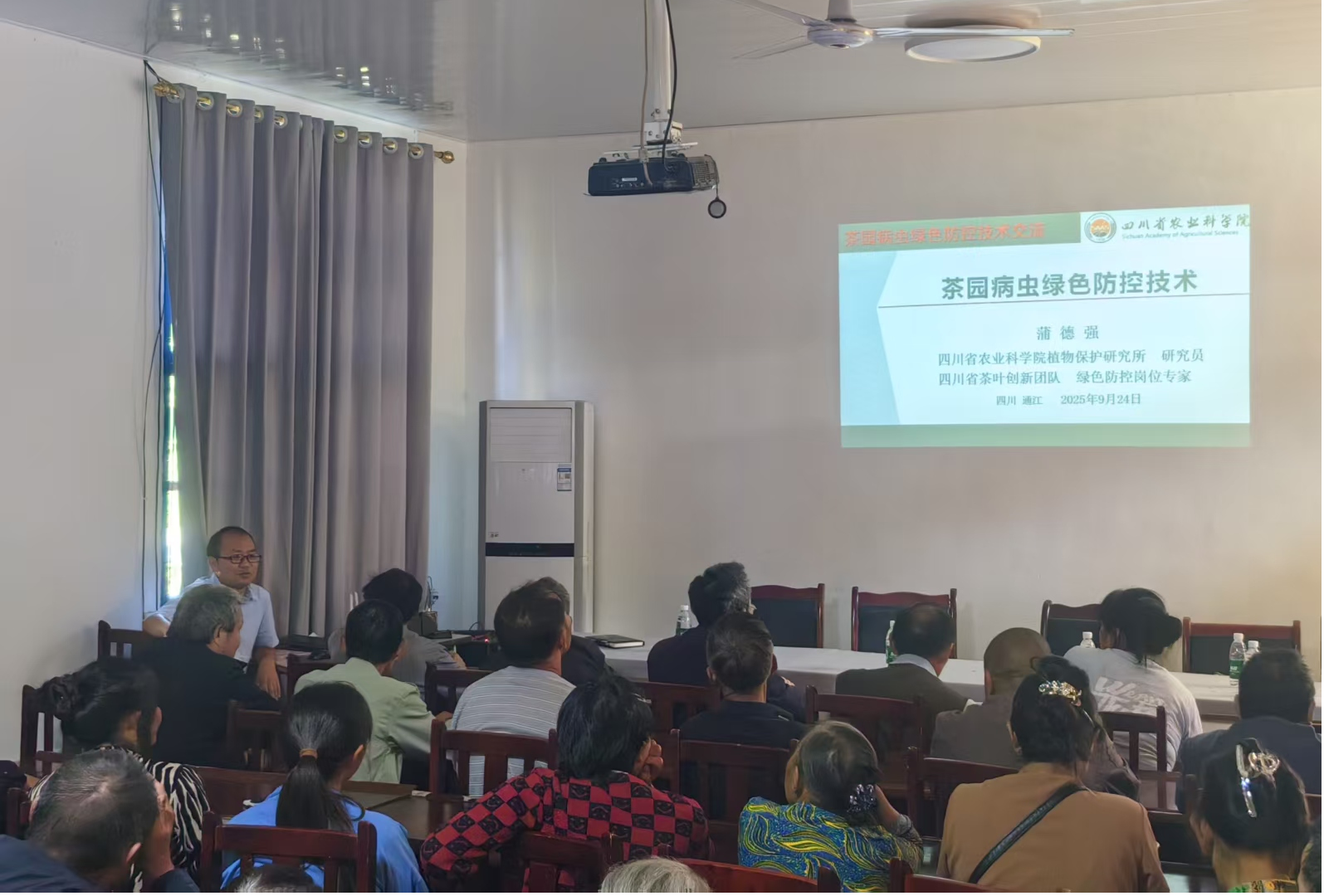 培训会上,王云研究员立足全省茶产业发展全局,深入剖析了当前四川茶产业的发展现状与趋势,并紧密结合通江县的区域特点与产业基础,为当地茶业的未来发展路径提出了具有前瞻性和可操作性的对策建议;刘飞副研究员详细介绍了工夫红茶品质特征、标准化加工工艺与核心技术参数,重点针对工夫红茶品质弊病进行了根源分析,提出了行之有效的解决策略与改进措施;王小萍研究员则聚焦于茶园管理的核心环节,详细讲授了以优质、高效为目标的现代化茶园生产管理技术;蒲德强研究员则围绕茶园生态安全,重点介绍了茶园常见病虫草的准确识别方法和为害规律,以及以生态调控为核心的绿色综合防控技术体系,强调了茶叶安全生产与品质保障的重要性。