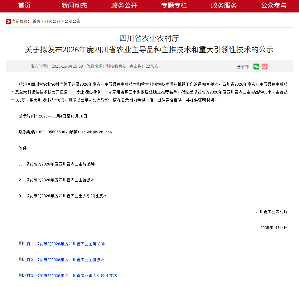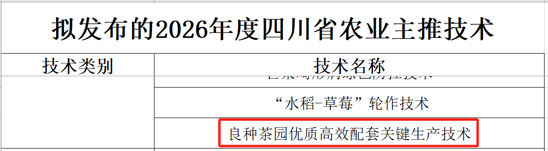 11月4日,四川省农业农村厅发布了2026年度四川省农业主导品种、主推技术和重大引领性技术名单,由四川茶叶创新团队、院茶叶所“茶树种质资源创新与利用”团队申报的“良种茶园优质高效配套关键生产技术” 入选四川省农业主推技术。该技术以我省近年选育登记的优良茶树品种为基础、结合当前茶产业转型升级发展需求,立足于当前茶产业标准化、机械化以及绿色高效发展的目标,通过“良种+良法”茶园配套关键生产技术的示范研究,优化形成了“良种茶园优质高效关键生产技术”。目前,该技术已在荥经、名山、雨城、天全、洪雅、夹江、马边、峨眉山、高县、筠连、屏山、旺苍、平昌、通江、青川、北川、纳溪等地示范推广约25.0万亩,技术成熟度高、绿色高效,推广示范成效获得广泛认可。另外,团队主持选育的“天府6号”也入选2026年农业主导品种。该茶树品种于2021年完成登记,具有发芽早、抗性强、游离氨基酸含量高等优良特性,适合在我省茶树适生区域进行推广应用。