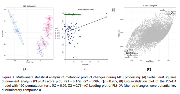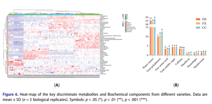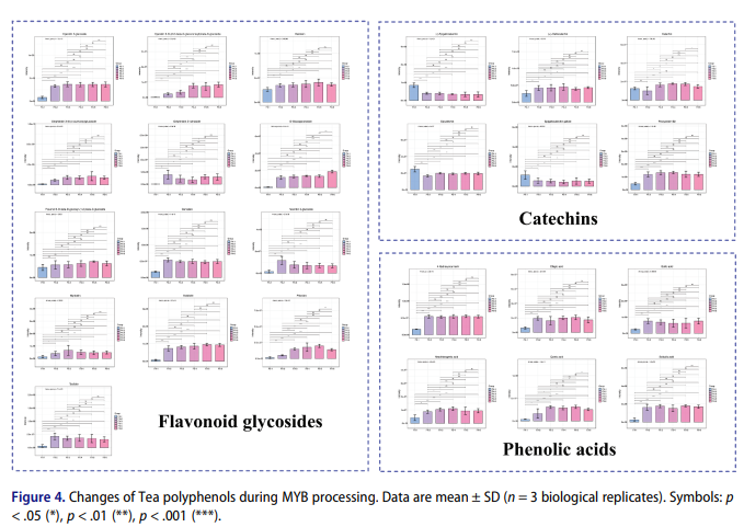 该研究团队以蒙顶黄芽为研究材料,采用代谢组学和化学计量学相结合的方法,在268种非挥发性代谢物中鉴定出49种关键代谢物,鉴定出了与鲜味和甜味相关的化合物,包括氨基酸、儿茶素、黄酮苷类、糖类、酚酸类、脂类和有机酸。研究首次从代谢层面揭示了蒙顶黄芽风味形成机制:茶叶中氨基酸、非酯型儿茶素、没食子酸含量的增加和酯型儿茶素的降解等综合作用是蒙顶黄芽滋味醇和甘甜、风味品质提升的主要原因。该研究为蒙顶黄芽风味的成因提供了新的代谢视角,也为高效生产优质蒙顶黄芽提供了理论基础。