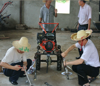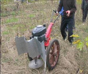 国家蚕桑产业技术体系研发中心设施与机械研究室(四川省农科院蚕业研究所)研制成功的手扶式燃油伐条机以小型手扶式微耕机为主体,增加枝条割伐装置,实现一机多用;主要采用驱动皮带轮加轮分出动力连接切伐园盘,升降可调。该装置将主传动皮带轮另制作双皮带轮,以直径小的带行走,从而达到要求,将主传动皮带轮改制作双皮带轮,以直径大的带伐条机构割。伐条动力机构将驱动皮带轮加轮分出动力连接切伐园盘。增加了拨枝导向装置。并对其总装和工作程序进行了改进。目前已在生产中应用推广。