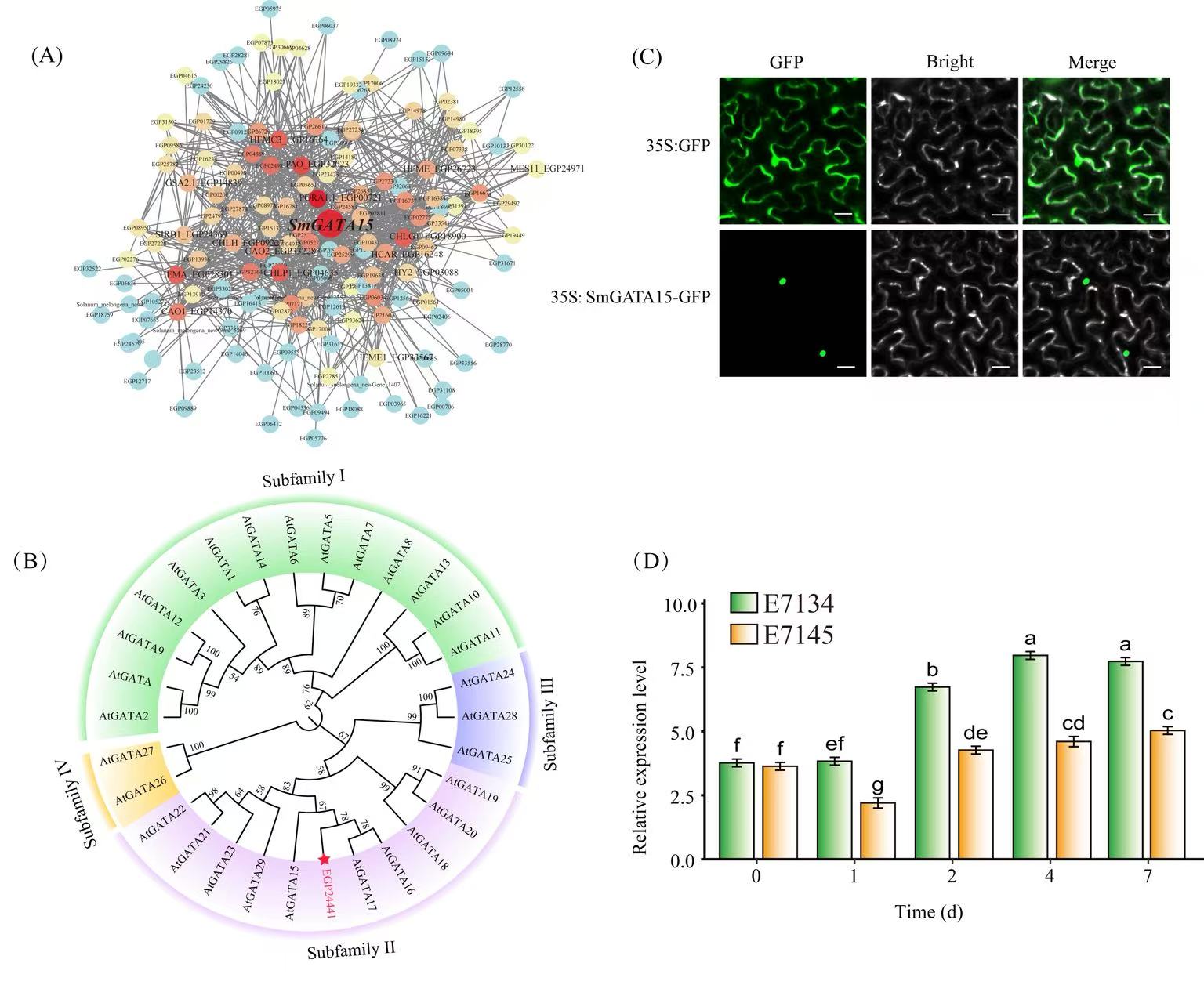 低温冷害是威胁茄子生产的主要因素之一,在茄子早春和秋延后栽培中频繁发生,严重影响了茄子的品质和产量。因此,提高茄子的耐低温抗性,已经成为生产中亟待解决的问题。然而,目前茄子耐低温的分子机制仍不明确。该团队采用组学联合分析鉴定出低温胁迫下叶绿素代谢核心调节因子SmGATA15,进一步明确其受低温高度诱导表达。首次发现SmGATA15通过激活叶绿素合成基因HEMA、CHLH、PORA的转录表达,抑制了叶绿素降解基因PAO的表达,促进叶绿素的合成,从而增强植株的耐寒性。