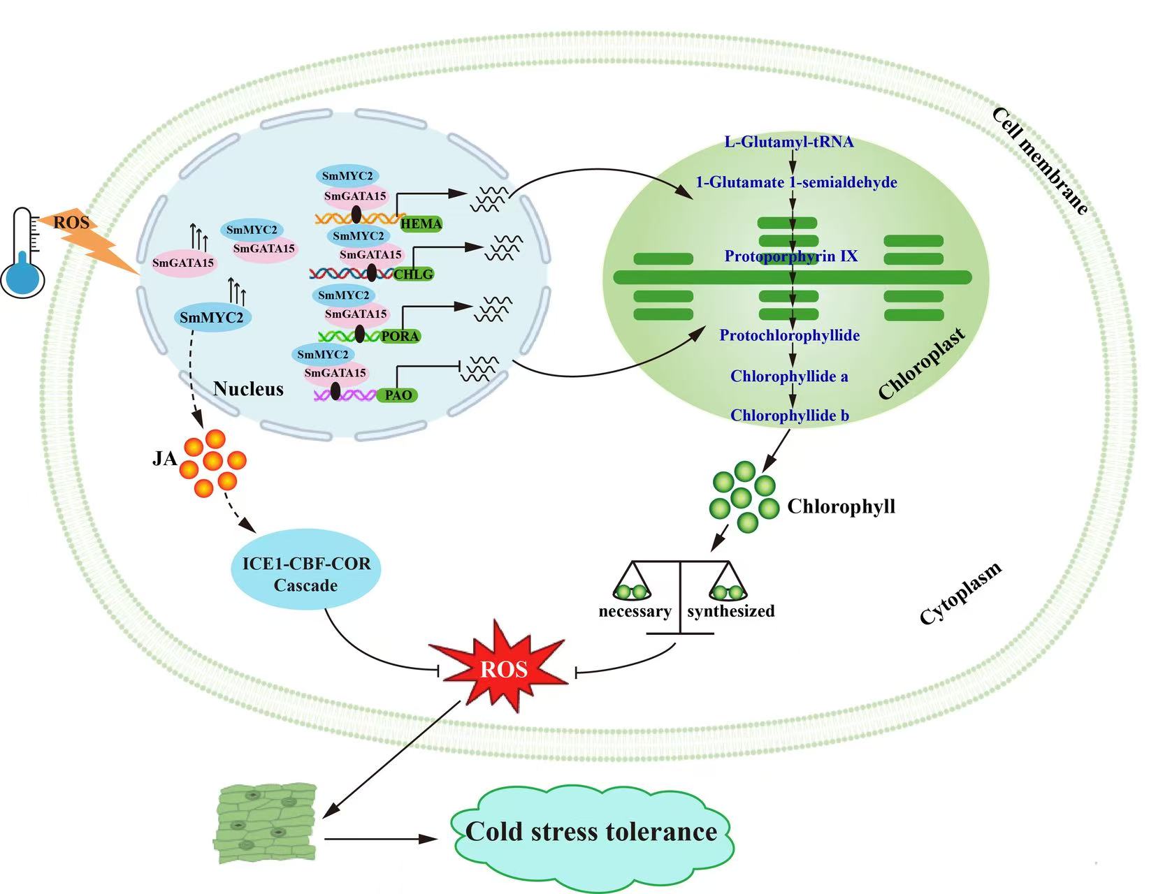 研究还发现,SmGATA15能与茉莉酸(JA)信号通路中的核心转录因子 SmMYC2 相互作用,形成转录复合体。这一复合体不仅增强了SmGATA15对叶绿素合成基因的激活效率,还通过SmMYC2诱导JA信号通路,增强冷响应基因(如ICE1-CBF1/2/3-COR)的表达,减少ROS的积累,进一步提高植株的耐寒性。
