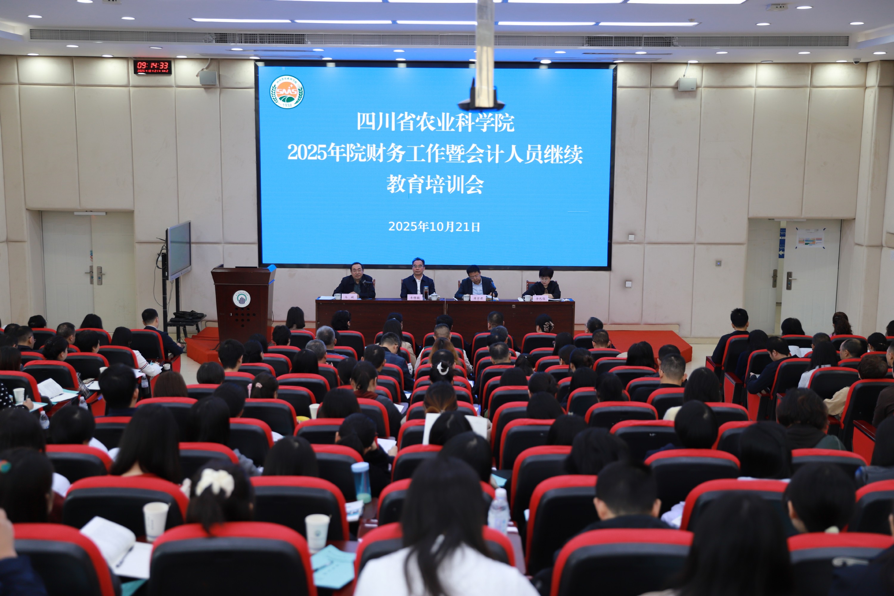10月21日,省农科院2025年财务工作暨会计人员继续教育培训会在四川财经职业学院顺利召开。院党委书记、院长牟锦毅出席会议并发表讲话,省纪委监委驻农业农村厅纪检监察组副组长马斌出席会议并发表讲话,院党委委员、副院长蒲宗君主持会议。四川财经职业学院党委委员、副院长李代俊出席开班仪式,并为本次培训会致辞。院属各单位法人、分管财务领导、政采负责人、财务人员,院机关各部门负责人及财务经办人员等170余人参加会议。