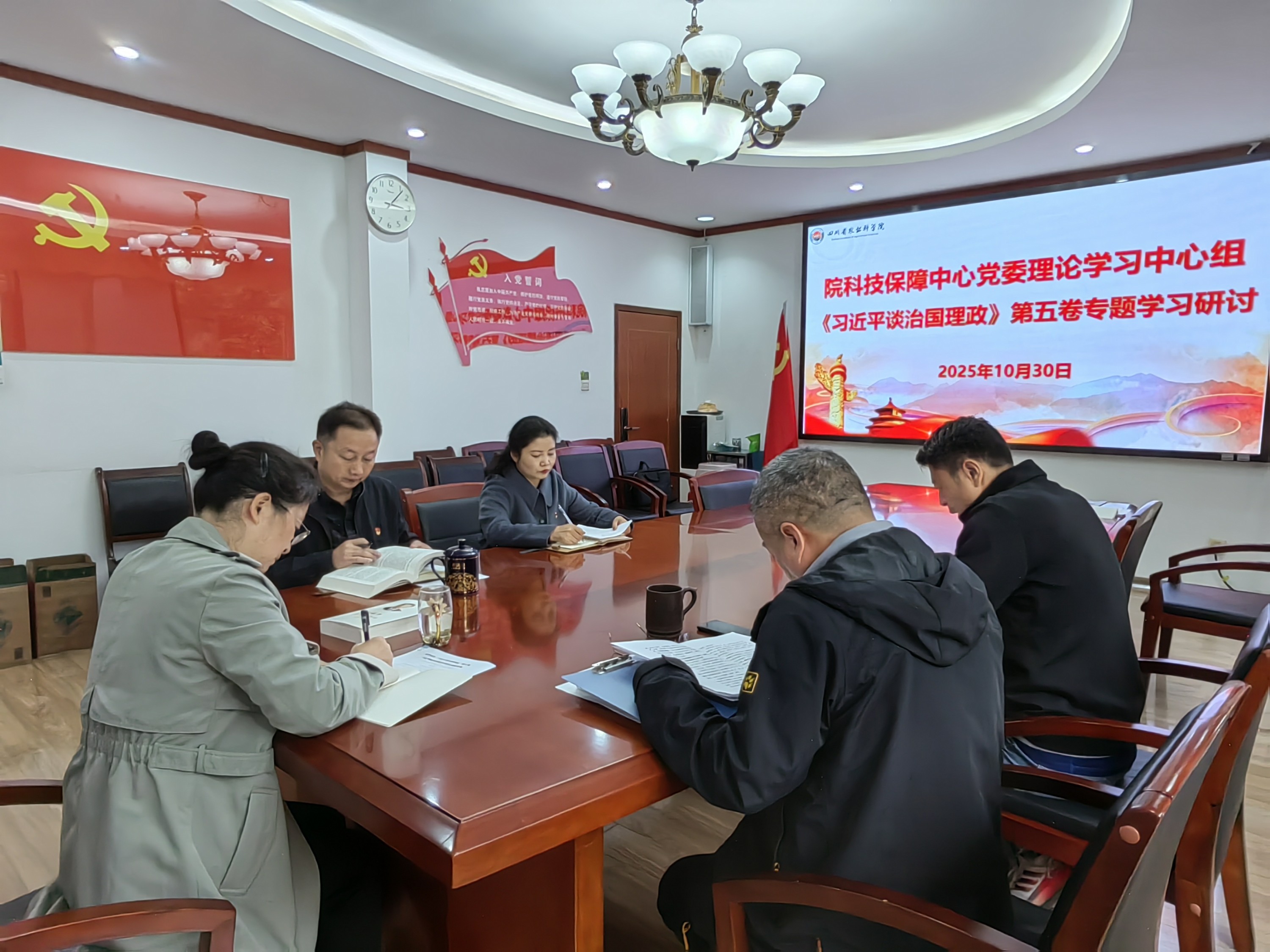 10月30日,四川省农业科学院科技保障中心召开党委理论学习中心组会议,围绕《习近平谈治国理政》第五卷开展学习研讨。中心党委书记黄芳芳主持会议,中心领导班子成员参加会议并作交流发言。