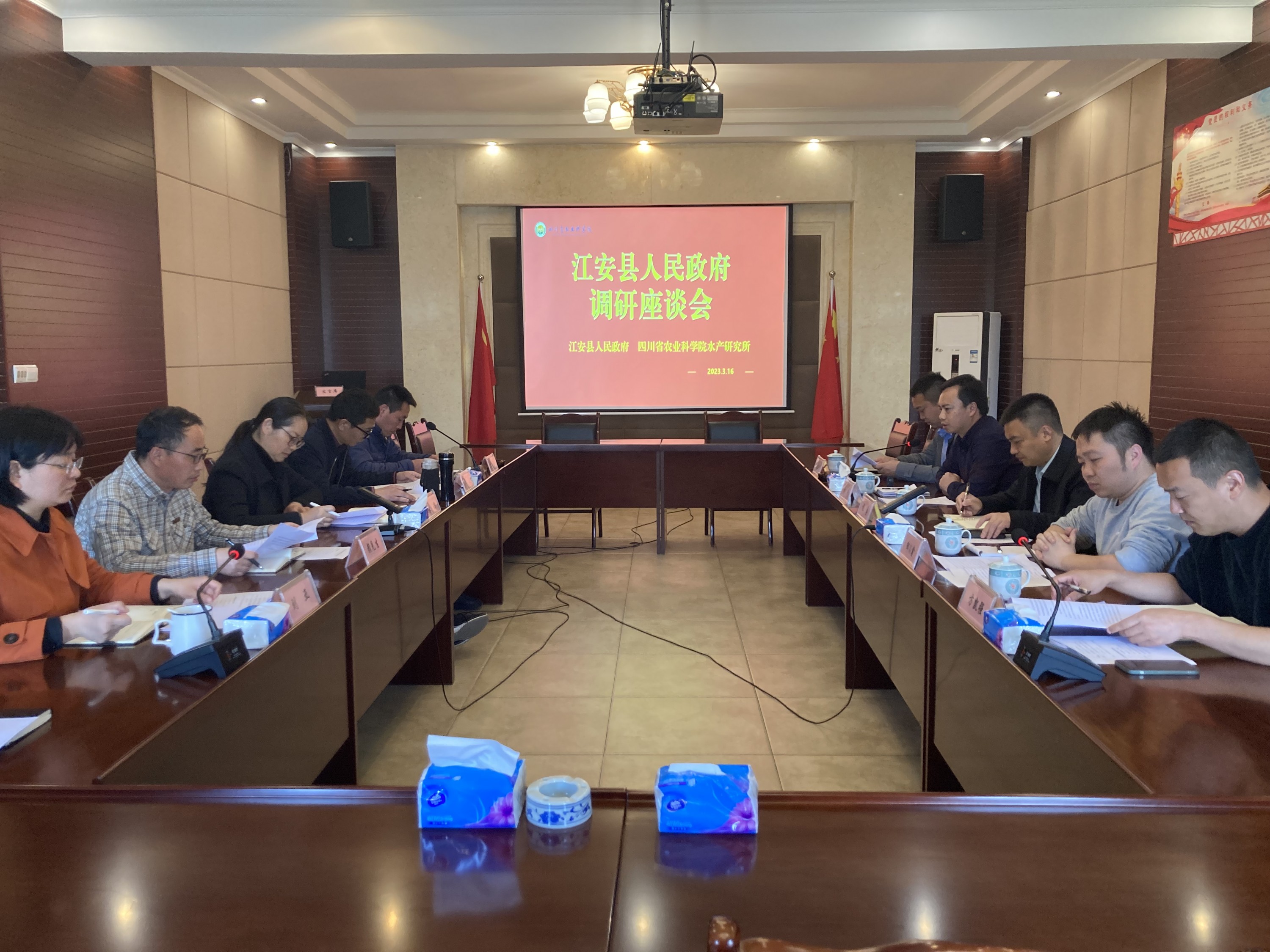 3月16日,江安县人民政府副县长程勇率队到院水产所调研交流水产养殖技术与尾水处理等工作。院水产所所长林珏、副所长周波、科研中心主任和科技人员接待并参加座谈会。