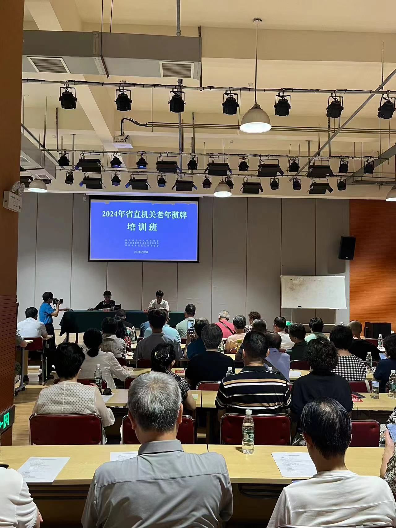 此次培训邀请到省掼牌运动协会总教练杨绍贵进行专题授课。杨绍贵首先简要介绍了掼蛋的起源,此项运动起源于江苏淮安,风靡于江苏、安徽两省,近年来流行到全国多地,是一种极具娱乐性和竞技性的四人游戏,玩家两两结对,以两副扑克牌为竞赛工具,进行智力对抗。接着,杨绍贵总教练详细讲解了掼牌游戏玩法的基本规则和基础知识,参加培训老同志不时举手提问,大家对学习掼牌兴致勃勃。