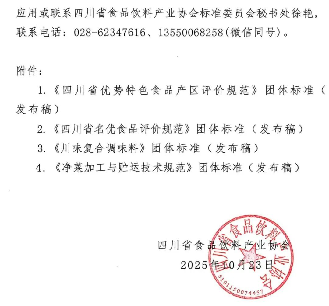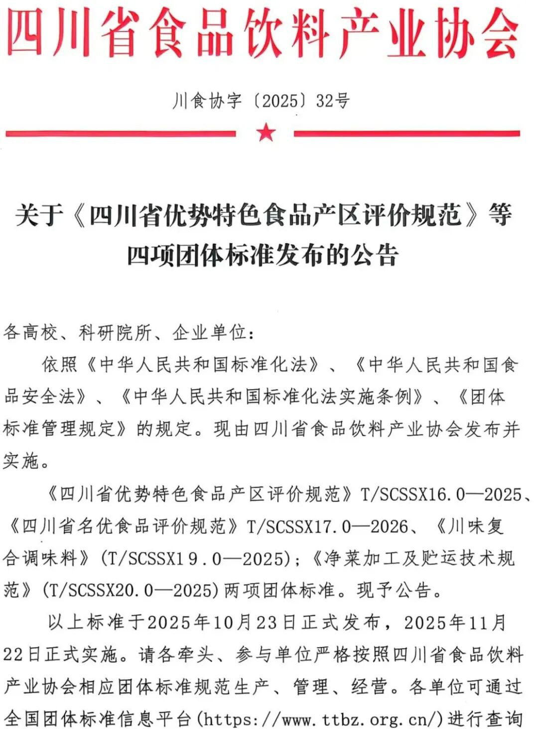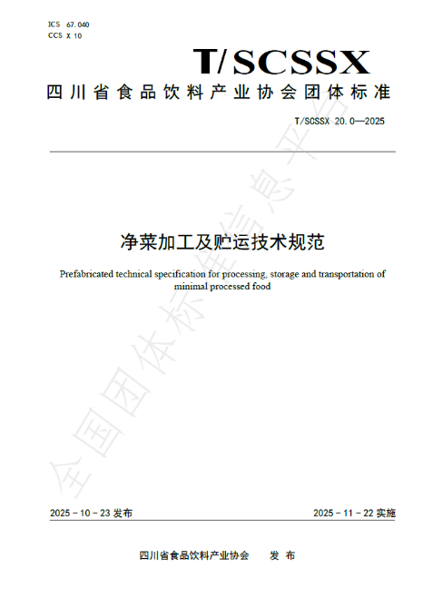 2025年10月23日,由院加工所牵头制定的T/SCSSX20.0—2025《净菜加工及贮运技术规范》团体标准经四川省食品饮料产业协会批准正式发布,将于2025年11月22日起实施。该标准是我省首个系统覆盖净菜加工与贮运全链条环节的技术规范,对提升产业标准化水平、保障产品质量安全具有重要意义。