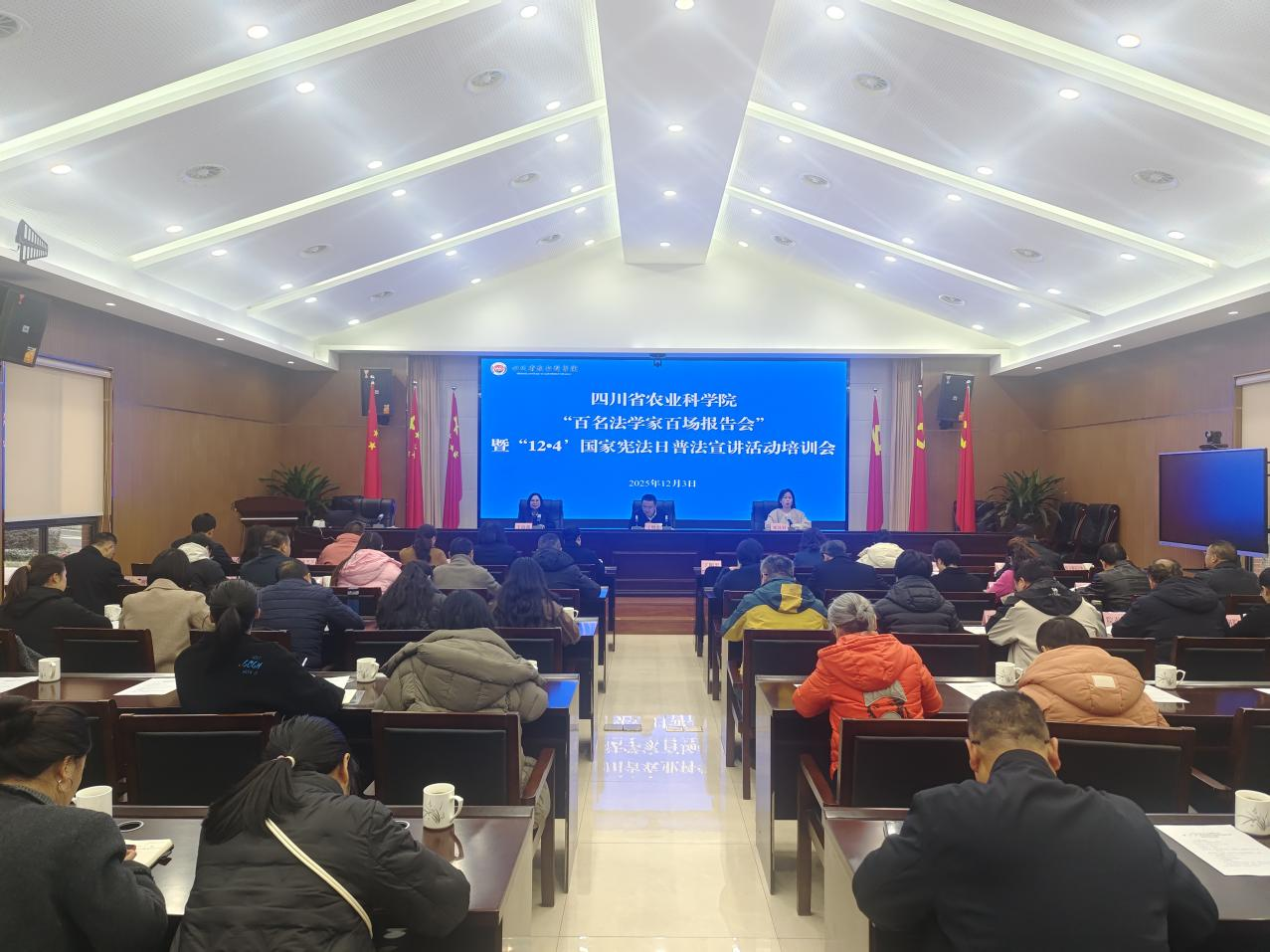 今年是习近平法治思想正式提出5周年,也是全民普法40周年和“八五”普法规划收官之年。根据《中央宣传部司法部全国普法办关于印发〈2025年全国“宪法宣传周”工作方案〉的通知》和《四川省2025年“百名法学家百场报告会”法治宣讲活动实施方案》有关要求,四川省农业科学院在院机关一楼会议厅组织召开了“百名法学家百场报告会”暨“12·4”国家宪法日普法宣讲培训会。院党委委员、副院长丁明忠出席会议并讲话。院机关各部门、院属各单位相关负责同志等60余人参加培训。会议由院法规审计处处长邓汉眉主持。