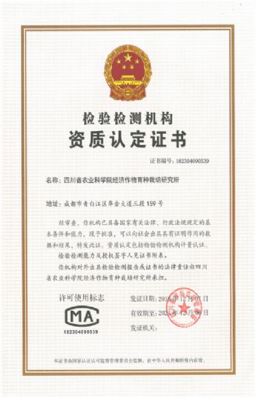 经济作物检测与评价平台为四川省农业科学院经济作物育种栽培研究所(简称:经作所)利用既有科研体系人员、设备等,按《检验检测机构资质认定管理办法》、《检验检测机构资质认定能力评价 检验检测机构通用要求》(RB/T214-2017)、《检验检测机构资质认定能力评价 食品检验机构要求》(RB/T215-2017)、《农产品质量安全检测机构考核评审细则》等要求,构建的经作所检验检测体系。该平台成立于2017年10月,并于2018年12月通过了CMA资质认定,具备检测黄曲霉毒素、阿魏酸、芍药苷、花青素、蛋白质、硝酸盐、浸出物、总灰分、可溶性固形物等指标的能力。在经作所80多年科研成果的支撑下,该平台不仅能提供官方认可的检测数据,而且能针对检测数据提供客观的评价及科学的咨询。