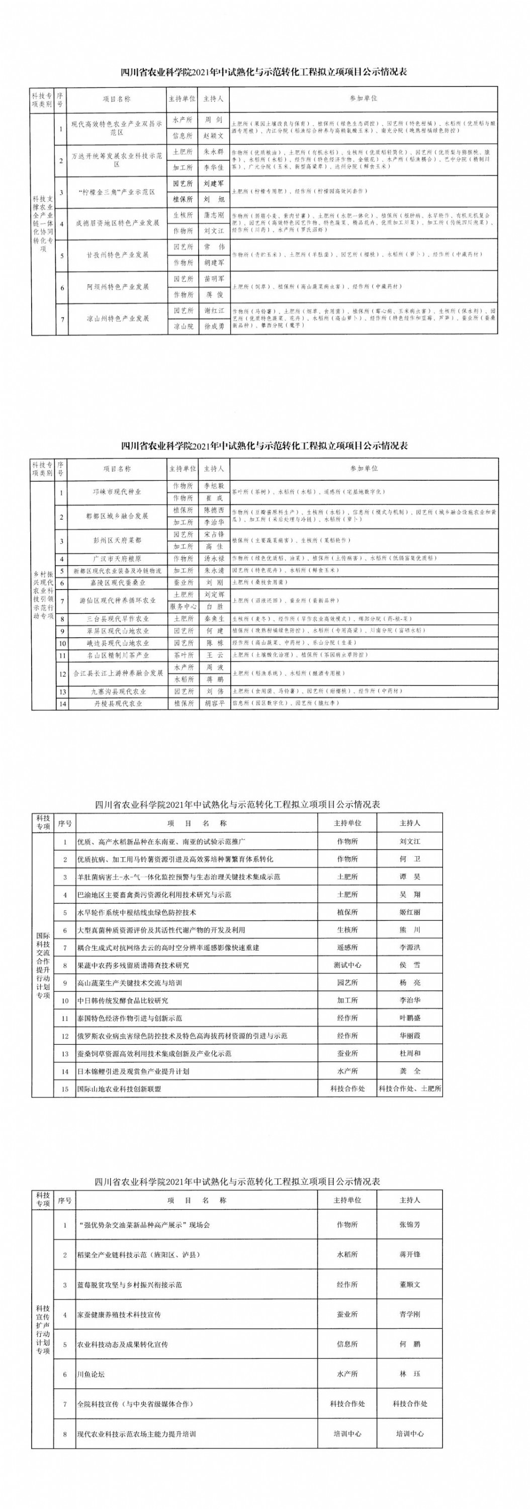 为抓好《四川省农业科学院强化成渝现代高效特色农业带建设科技支撑行动方案》《四川省农业科学院加快推进脱贫攻坚与乡村振兴有效衔接科技支撑行动方案(2020—2025年)》落地见效,根据《四川省农业科学院关于征集2021年及“十四五”科技成果中试熟化与示范转化工程项目的通知》(农院函〔2020〕206号),面向全院(含分院)征集“科技支撑农业全产业链一体化协同转化”“乡村振兴现代农业科技引领示范行动”“国际科技交流合作提升行动”“科技宣传扩声行动”4个支撑专项共计300个项目,通过形式审查、专家评审推荐、主持人推荐、综合研究评定,初步确定2021年拟立项项目。按程序,现予公示(详见附表)