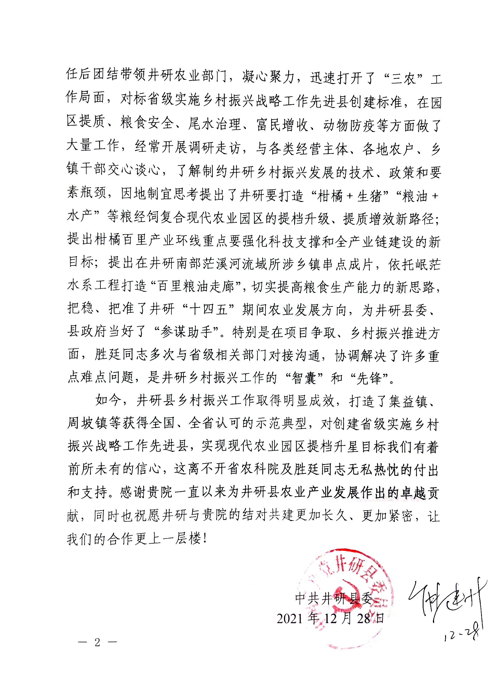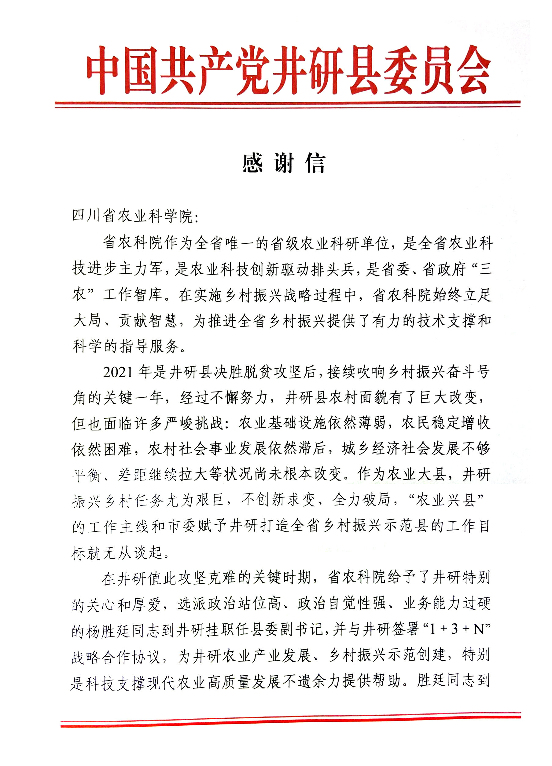 井研县委、县政府感谢我院作为全省农业科技进步的主力军、农业科技创新驱动的排头兵和“三农”工作的重要智库,在实施乡村振兴战略中,立足大局、贡献智慧,为推进全省乡村振兴提供了有力的技术支撑和科学的指导服务;杨胜廷同志团结带领井研县农业部门打开了“三农”工作的新局面、找准了园区提档升级都新路径、提出了产业提质增效的新目标、把准了“十四五”农业发展的新方向,为井研县委、县政府当好了“参谋助手”。井研县乡村振兴工作取得的明显成效,离不开省农科院和杨胜廷同志无私热忱的付出和支持。