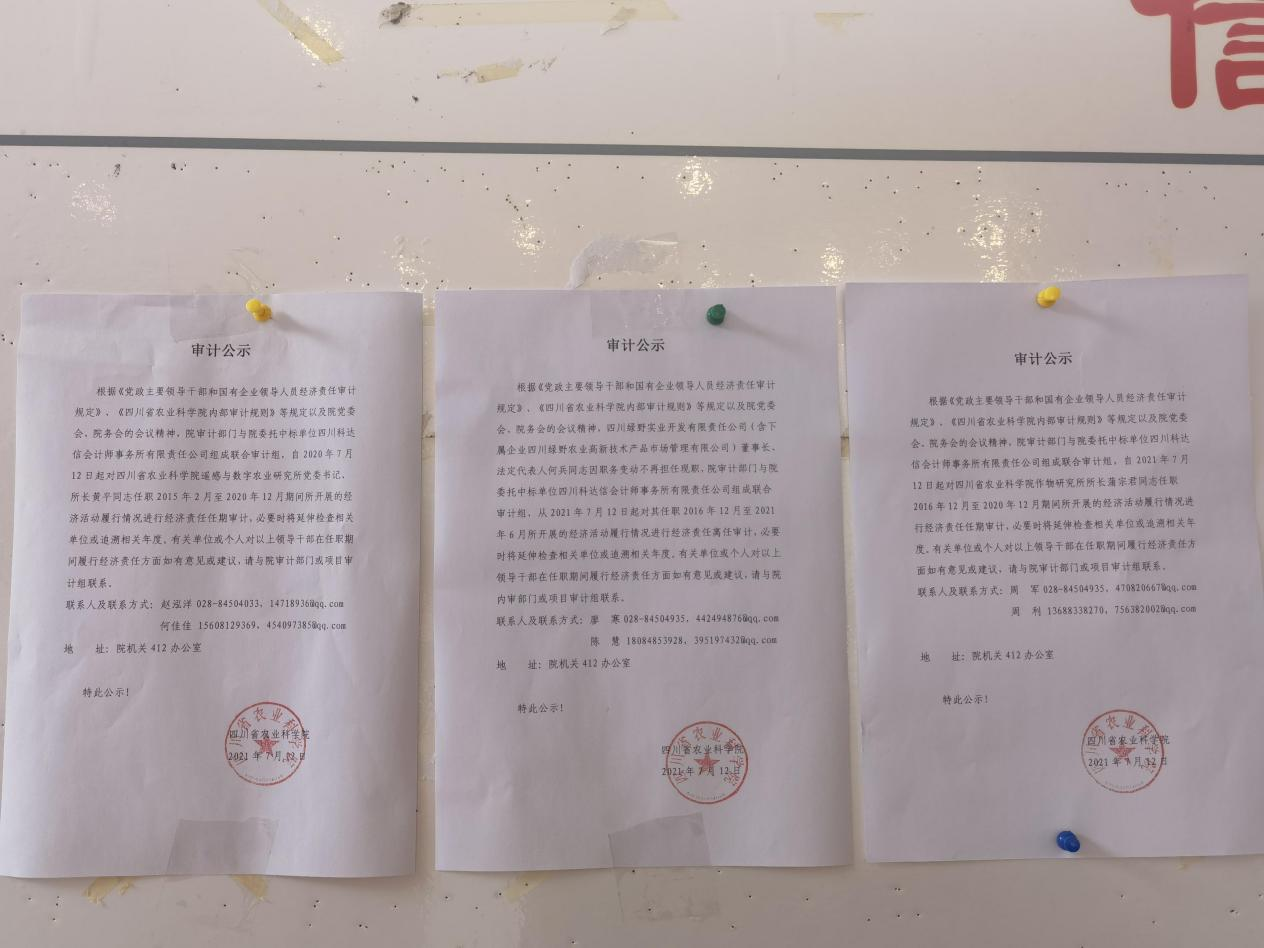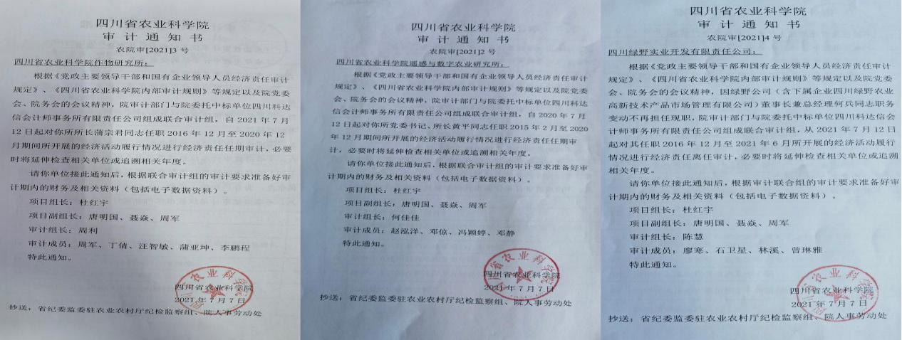 根据《党政主要领导干部和国有企业领导人员经济责任审计规定》、《四川省农业科学院内部审计规则》等规定及院党委会、院务会的会议精神,院审计部门与院委托中标单位四川省科达信会计师事务所有限责任公司组成联合审计组。本次审计项目组组长杜红宇,副组长唐明国、聂焱、周军,下设3个审计小组,自2021年7月12日起分别入驻院作物研究所、院遥感与数字农业研究所、四川绿野实业开发有限责任公司开展各单位负责人的经济责任审计工作。7月12日至14日院审计部门分别召开了院属3家单位的审计见面会。