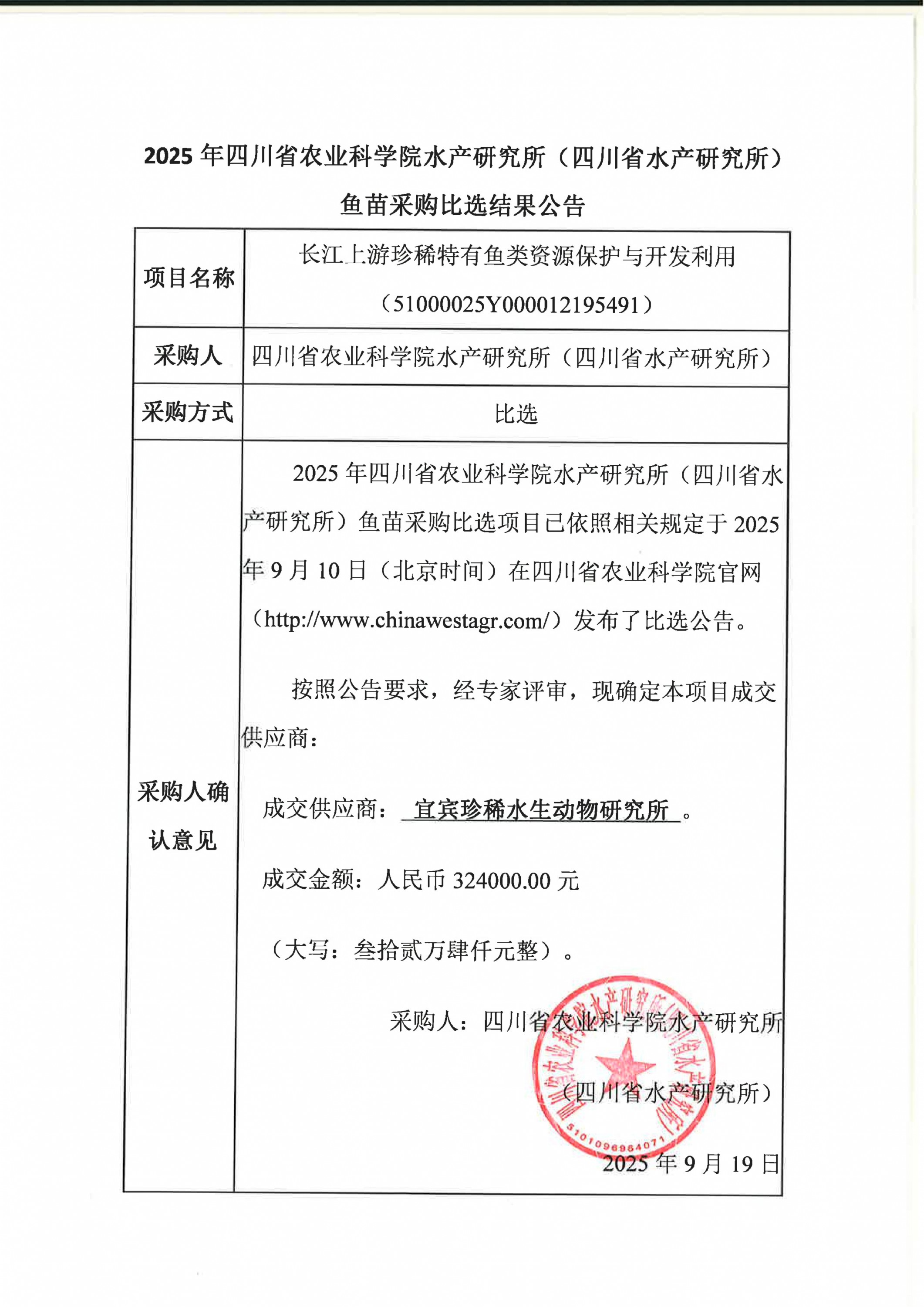 2025年四川省农业科学院水产研究所(四川省水产研究所) 鱼苗采购比选结果公告