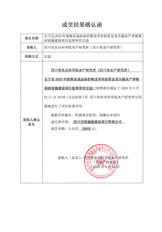 长宁县2023年度渔业成品油价格改革补贴资金龙头镇水产养殖基础设施建设项目监理单位比选成交结果公告