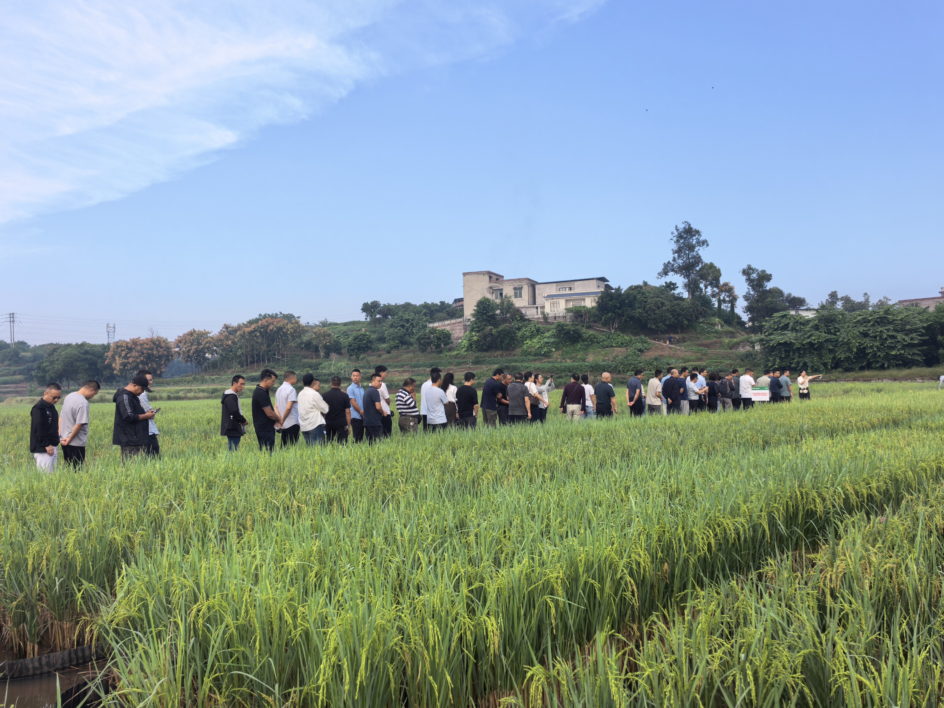 与会人员现场观摩院水稻高粱所泸县再生稻试验基地及再生稻科技展馆。植物保护研究中心副主任郭晓艺研究员在田间向参会人员详细介绍了基地开展的再生稻试验情况。