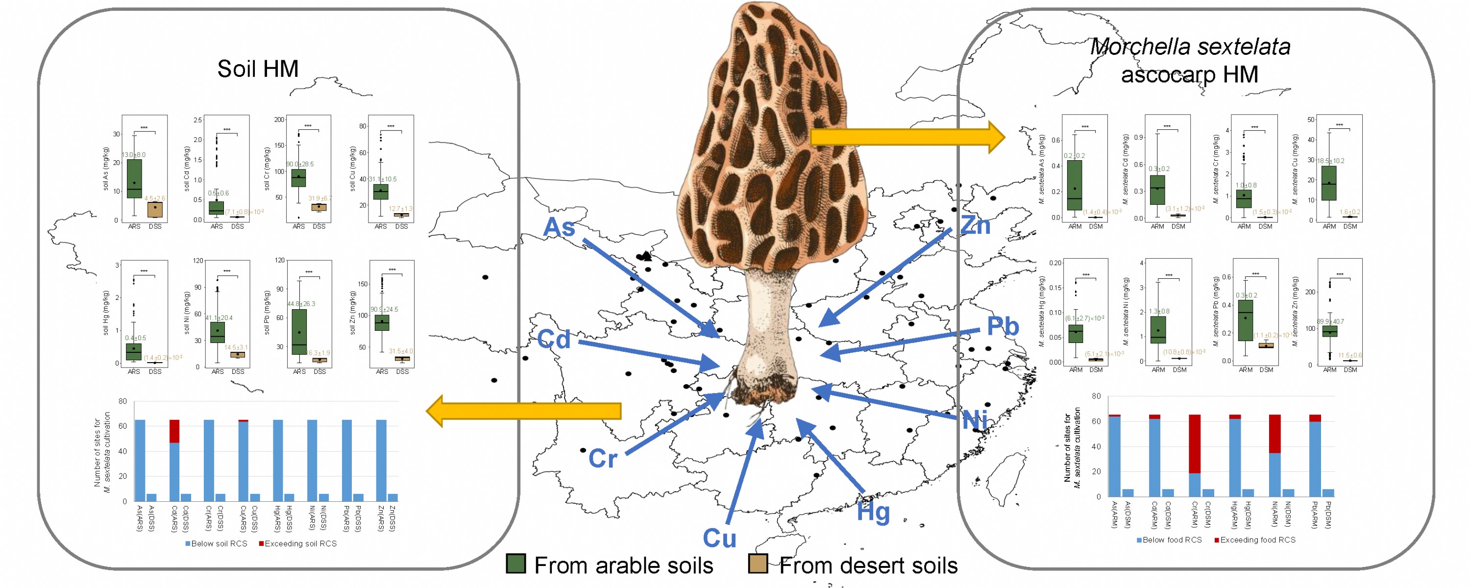 四川省食用菌研究所与中国科学院西北生态环境与资源研究院合作,对全国29个省市自治区71个地点的213个土壤样品及这些土壤产出的羊肚菌样品进行了收集、整理和分析,采样地点涵盖了温带季风气候、亚热带季风气候、温带大陆性气候等多个气候带,土壤类型包括水稻土、黏壤土、砂壤土、沙漠等。研究结果以谭昊研究员作为通讯作者撰写论文《A nationwide study of heavy metal(loid)s in agricultural soils and the soil-grown black morel Morchella sextelata in China》,发表于《Journal of Environmental Management》(环境管理期刊,中科院二区TOP,影响因子8.0)。
