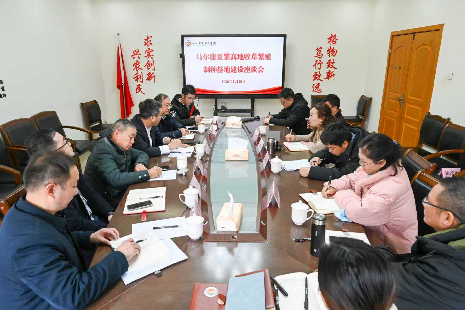 2026年2月10日,院资环所在所2楼组织召开马尔康夏繁高地牧草繁殖制种基地建设座谈会。西南草牧业协同创新中心共建单位中国农业科学院草原研究所科研管理处处长李元恒、院基地基建处处长鲜小林、中共马尔康市委常委李浦、阿坝州农业农村局总农艺师李学强、院草业科技协同创新中心代表巴中市农林科学研究院副院长李林祥和省畜科院养羊与草业科学研究所所长季杨、四川康巴情生态农牧科技集团有限公司董事长唐一国等相关专家及企业代表参加座谈会。会议由院资环所副所长朱永群研究员主持。