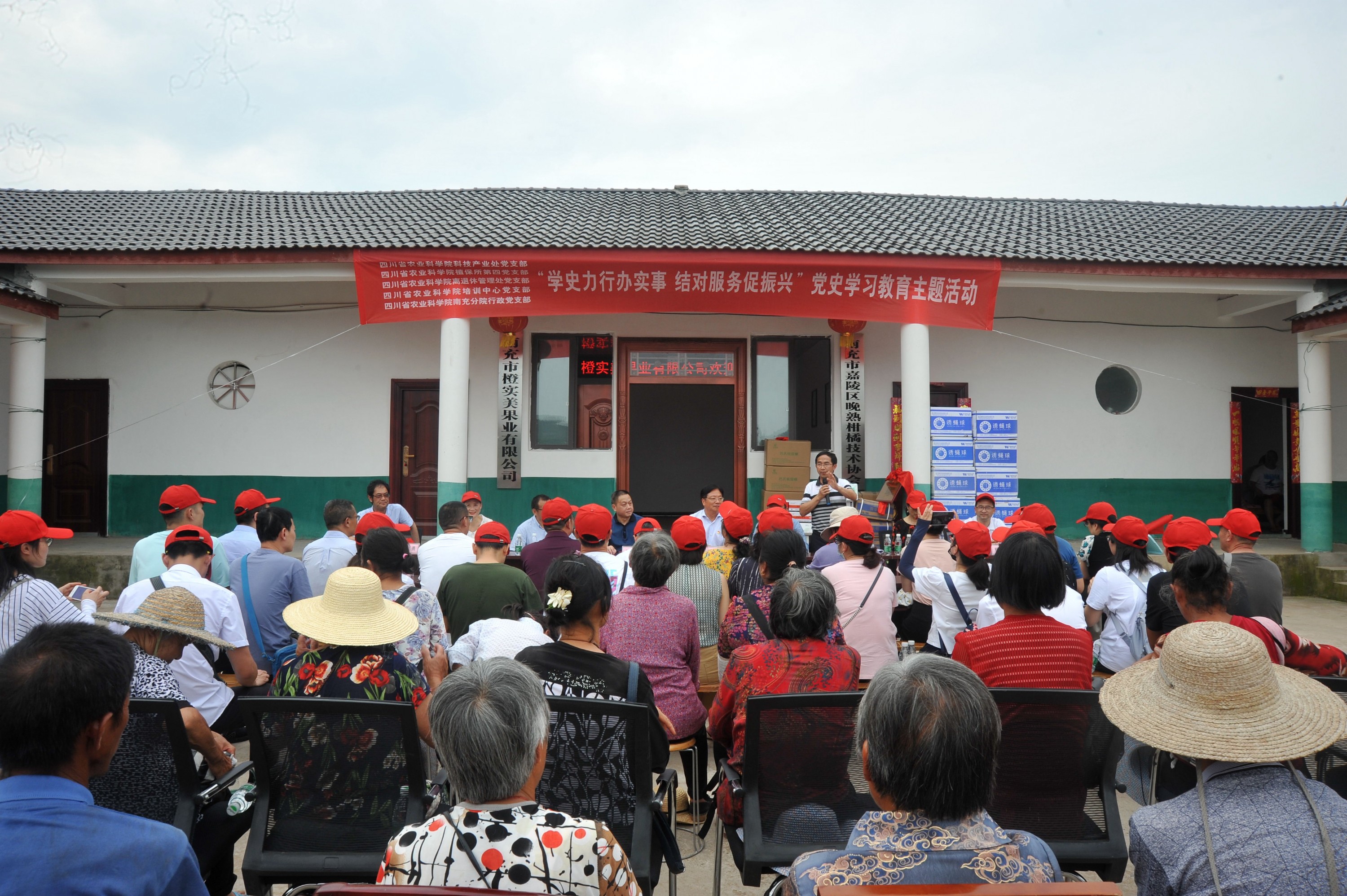 15:40时左右,党员干部们与橙实美公司员工、当地部分种植户近100人围坐在橙实美公司晒坝内,举行结对共建仪式和技术培训会。在热烈的掌声中,钟毅、杨武云、杨洪江、黎德富等领导与五个党支部的负责人一起,在现场人员的集体见证下,向橙实美公司董事长弋军颁授了“科技结对服务企业”牌匾,捐赠了太阳能杀虫灯、诱蝇球、黄板、七星瓢虫、捕食螨、高效低毒农药等价值近10万元的绿色防控物资。刘旭在仪式上宣布:从今天起,省农科院科技产业处党支部、植保所第四党支部、离退休管理处党支部、培训中心党支部和南充分院(南充市农业科学院)行政党支部对橙实美公司技术帮扶3-5年,将这里1600余亩的晚熟柑橘打造成南充市、四川省甚至是西南地区品质上乘、绿色环保的知名品牌,示范带动嘉陵区10万亩柑橘特色产业发展和当地农民的富裕富足,助推嘉陵区脱贫攻坚成果与乡村振兴的有效衔接。弋军十分感谢省、市农科院的支持、指导和物资帮助,他说,有了你们这些领导、专家的技术支持,橙实美公司对晚熟柑橘产业的发展充满了信心、有了底气。他表示,橙实美公司一定按照专家们的规划方案、技术指导要求,搞好果园建设和果树的田间管理,让晚熟柑橘早开花早结果早见效,不辜负各级领导、各位专家的厚爱。钟毅要求五个党支部做实科技结对服务企业这个事,不能虎头蛇尾。他说,只有做实了,被服务的企业、群众才能感受到党的温暖、科技的力量,我们农业科研院所服务社会的功能才能得到充分彰显,人民群众才会更加信任我们。