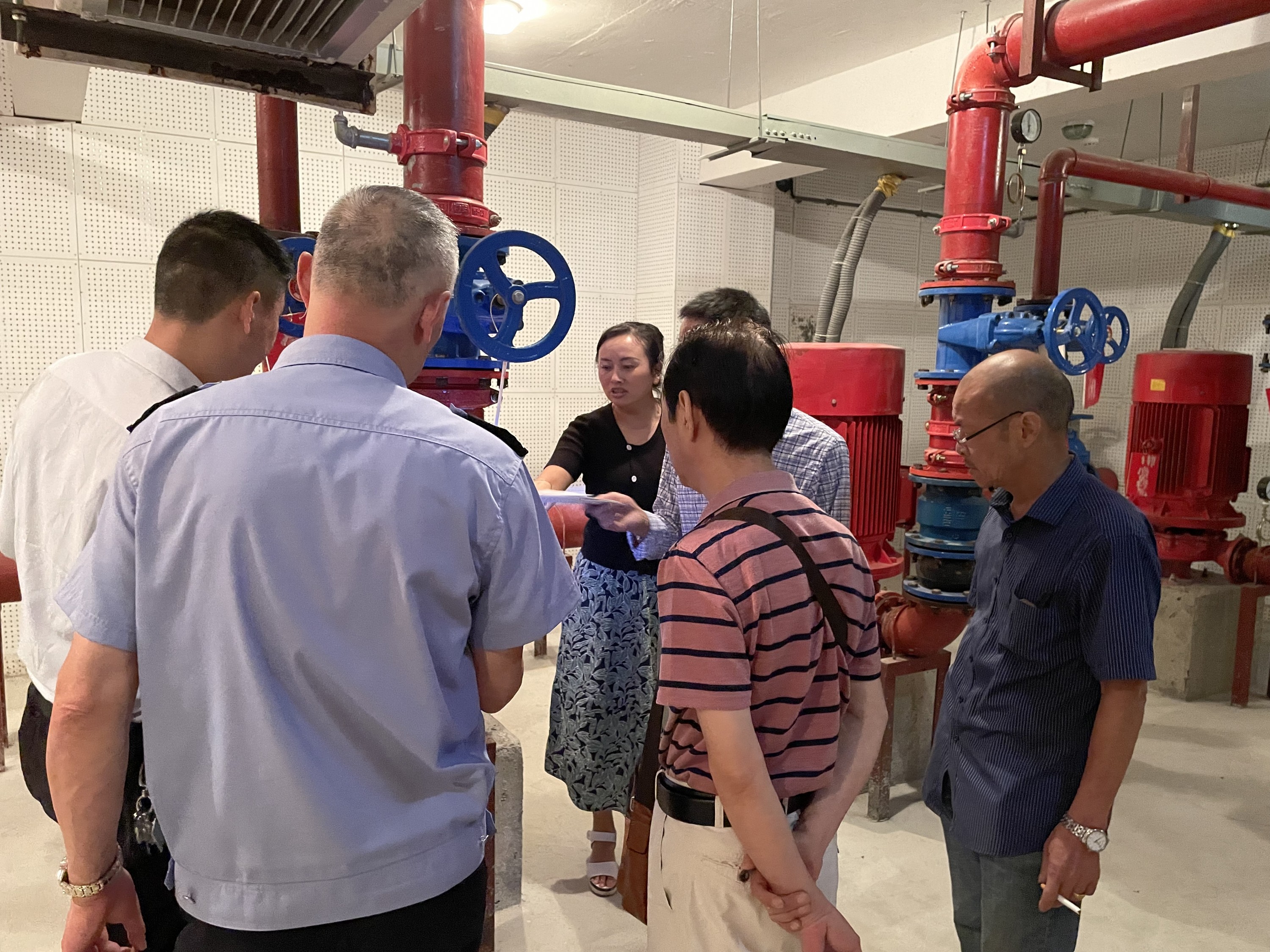 (上图为检查组检查小区负二层的泵房水泵运转状况)