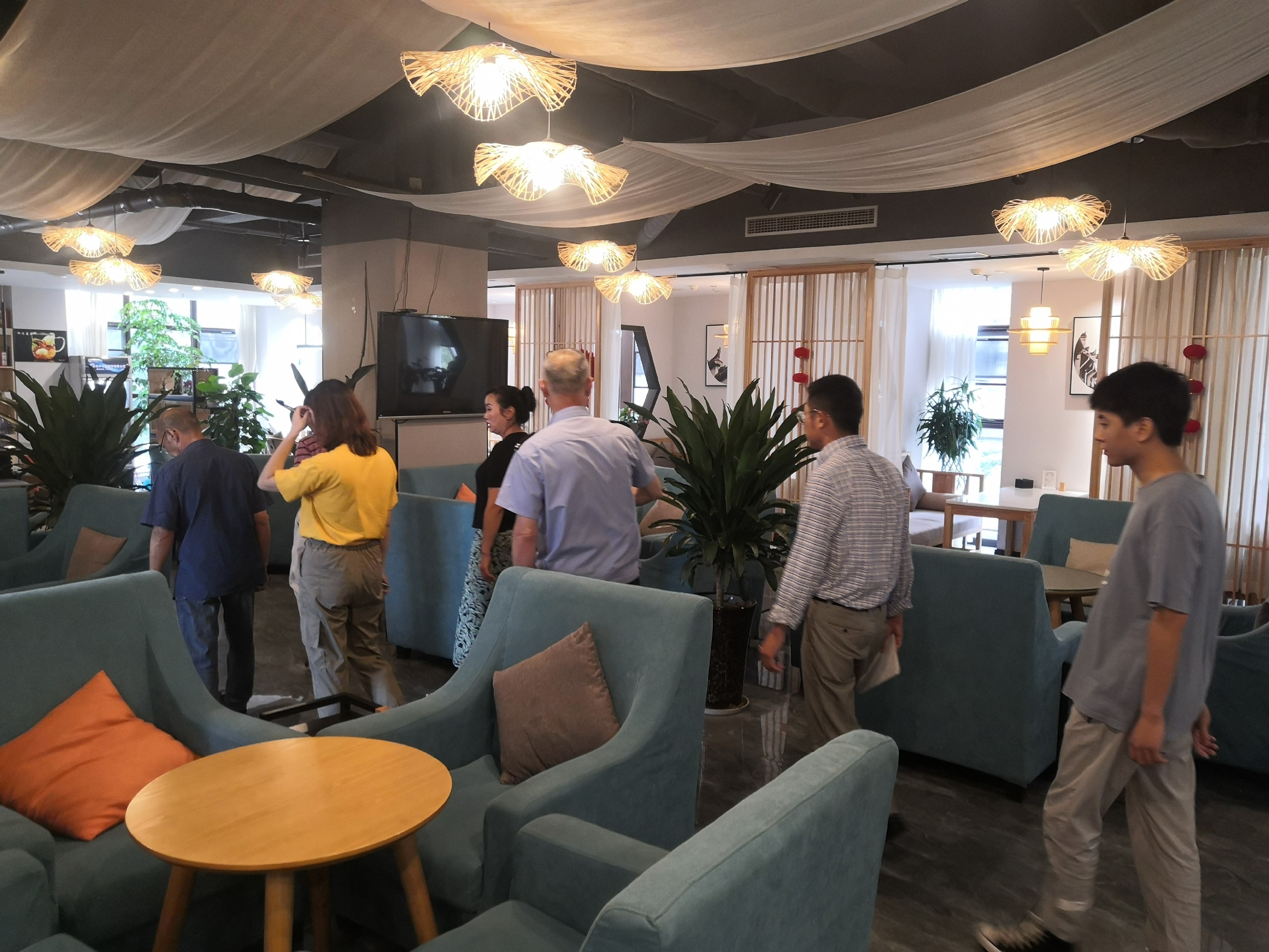 (上图为检查组检查1号楼3楼汉风茶楼的安全卫生情况)