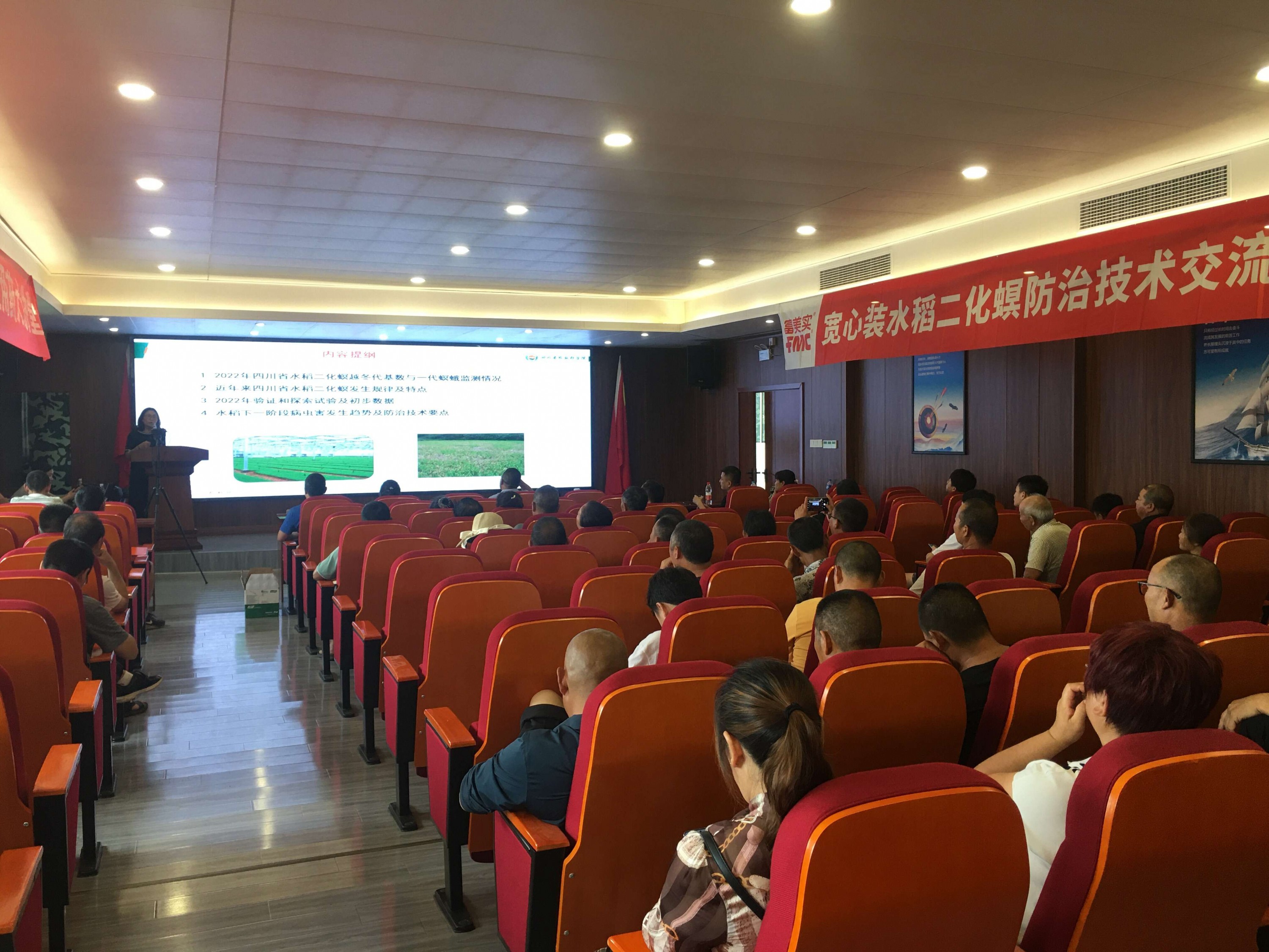 水稻病虫害防控技术培训会于6月17日在邛崃市藏梦羊生态山庄举行,邛崃市农业农村局、富美实技术服务部、邛崃市水稻种植专合社、种植大户、农资经营者及眉山市、德阳市部分水稻种植大户等100余人参加。参会人先到邛崃前进镇双江村水稻种植基地看了水稻螟虫防治现场,参看前期不同药剂处理模式螟虫防治效果,然后到藏梦羊生态山庄会议室开展室内专题培训会。卢代华研究员做了水稻病虫害防控专题报告,主要内容包括2022年四川省水稻二化螟越冬代基数与一代螟蛾监测情况、近年来四川省水稻二化螟发生规律及特点、2022年验证和探索的一些试验方案、水稻下一阶段病虫害发生趋势及防治技术要点,以期解决水稻螟虫防治难的问题,6月26日继续开展网络直播培训。