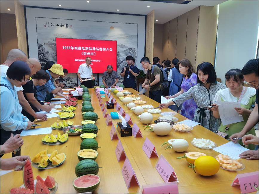 在田间,蔡鹏副研究员向与会人员展示了28个自主选育和新引进适合采摘的西甜瓜新品种,品种类型丰富,涵盖不同皮色、瓤色、口感和风味等。详细介绍了各个品种的田间长势、抗性和产量等特性,重点介绍了品种的栽培技术和效益等。随后,与会人员在室内对28个品种进行逐一品鉴,并分别从外观、剖面、色泽、口感等方面打分评价。根据现场外观和口感等指标优选出小西瓜和甜瓜品种各3个。甜瓜品种中我院园艺所培育的“川蜜脆玉”、“川蜜香玉”和“新组合F82”获得大家的一致好评。采用现场观摩与品鉴相结合的方式,可以让种植户对新品种的品种特性有了更全面、更直观的了解,避免品种选择的盲目性。