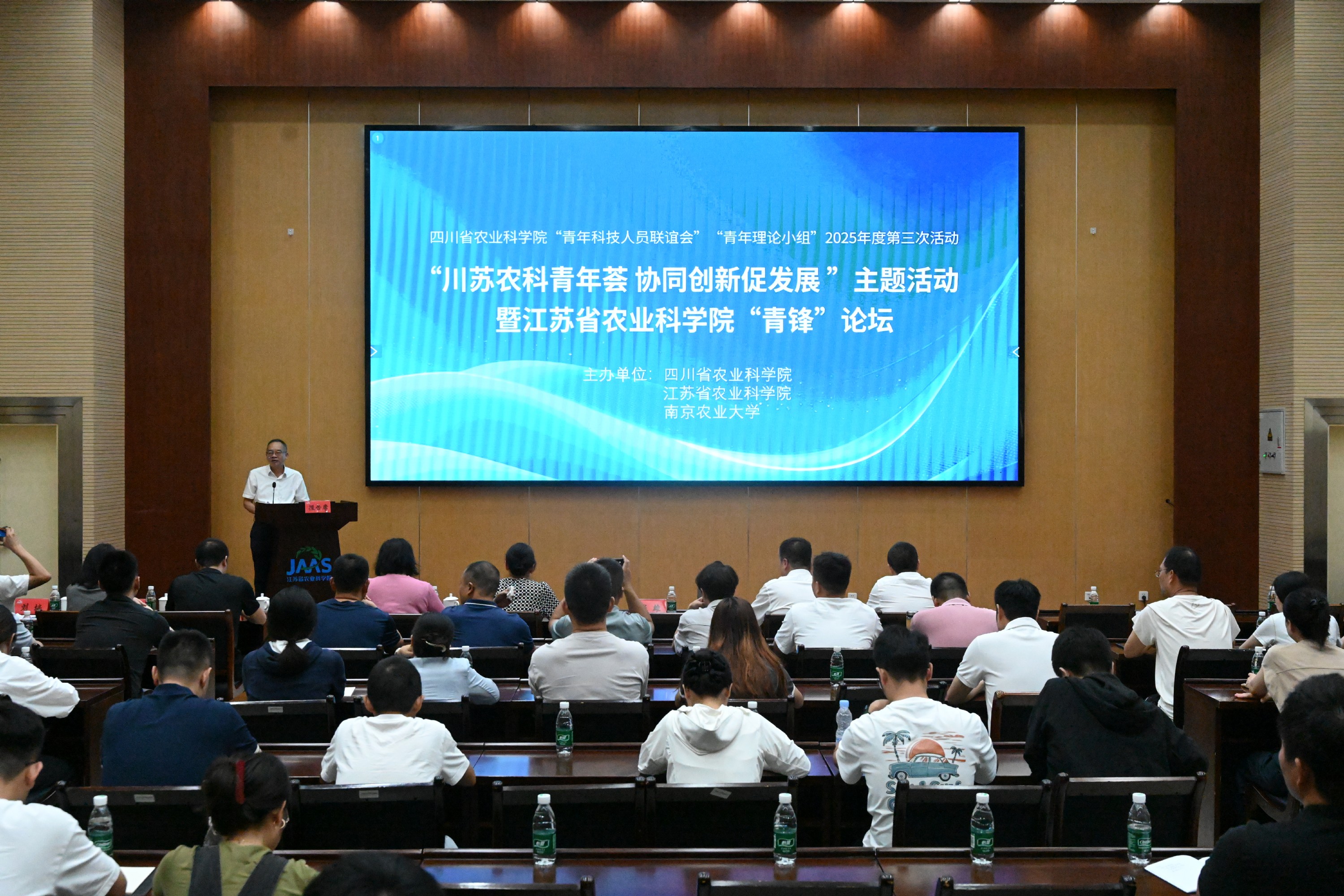 参观结束后,“川苏农科青年学术交流会”随即召开,院党委副书记张雄、江苏省农业科学院党委副书记黄俊出席了本次会议,会议由院科技管理处处长王自鹏主持。交流会特邀江苏省农业科学院徐磊研究员、唐楚飞副研究员,南京农业大学佟昊教授、夏青副教授及我院唐杰研究员、王思副研究员等六位优秀青年专家作学术报告。各报告人围绕成果转化应用、智慧农业、绿色防控、智能育种等前沿领域,分享了各自的最新研究进展与思考。院党委副书记张雄在会议讲话中强调:我院要积极向江苏农科院、南京农业大学学习和加强合作,力求实现“1+1+1>3”的协同效应。青年科技人员是未来攻坚克难的主力军,必须胸怀农业强国的远大目标。为此,一要开拓视野、加强交流,以新灵感打破学科壁垒;二要聚焦国家重大战略需求,协同创新共克难题;三要深化友谊、奋力拼搏,共同为农业现代化发展贡献力量。