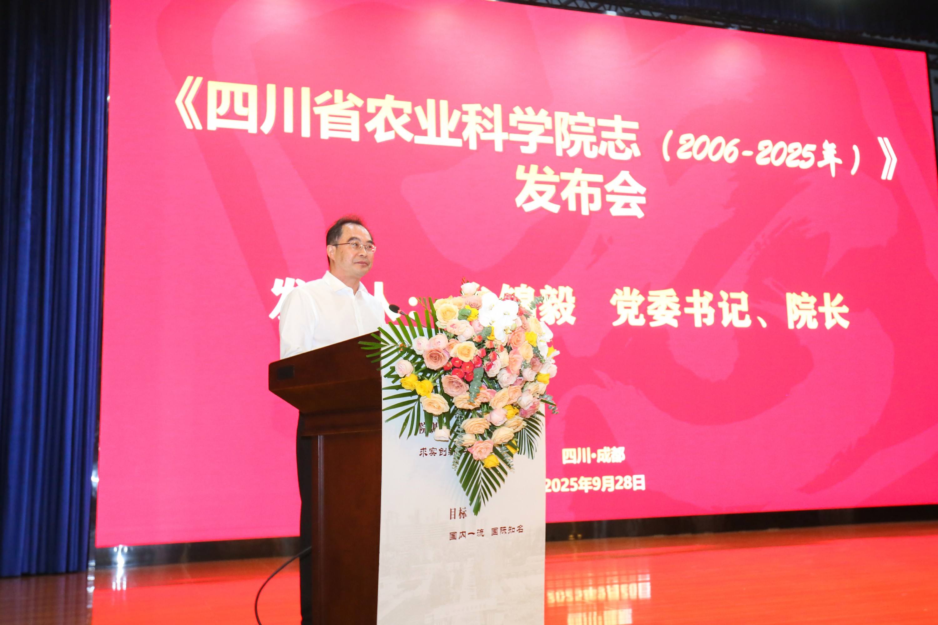 9月28日下午,《四川省农业科学院志(2006—2025年)》发布会在成都隆重召开。院党委书记、院长牟锦毅出席会议并致辞。中国测试技术研究院党委书记、院长周传军,省统计局党组成员、副局长蒋勇,省地方志办党组成员、副主任刘自强,中国农业科学技术出版社党委书记、社长张庆忠,省农业农村厅总经济师李宇飞应邀出席会议。会议由院党委委员、副院长丁明忠主持。