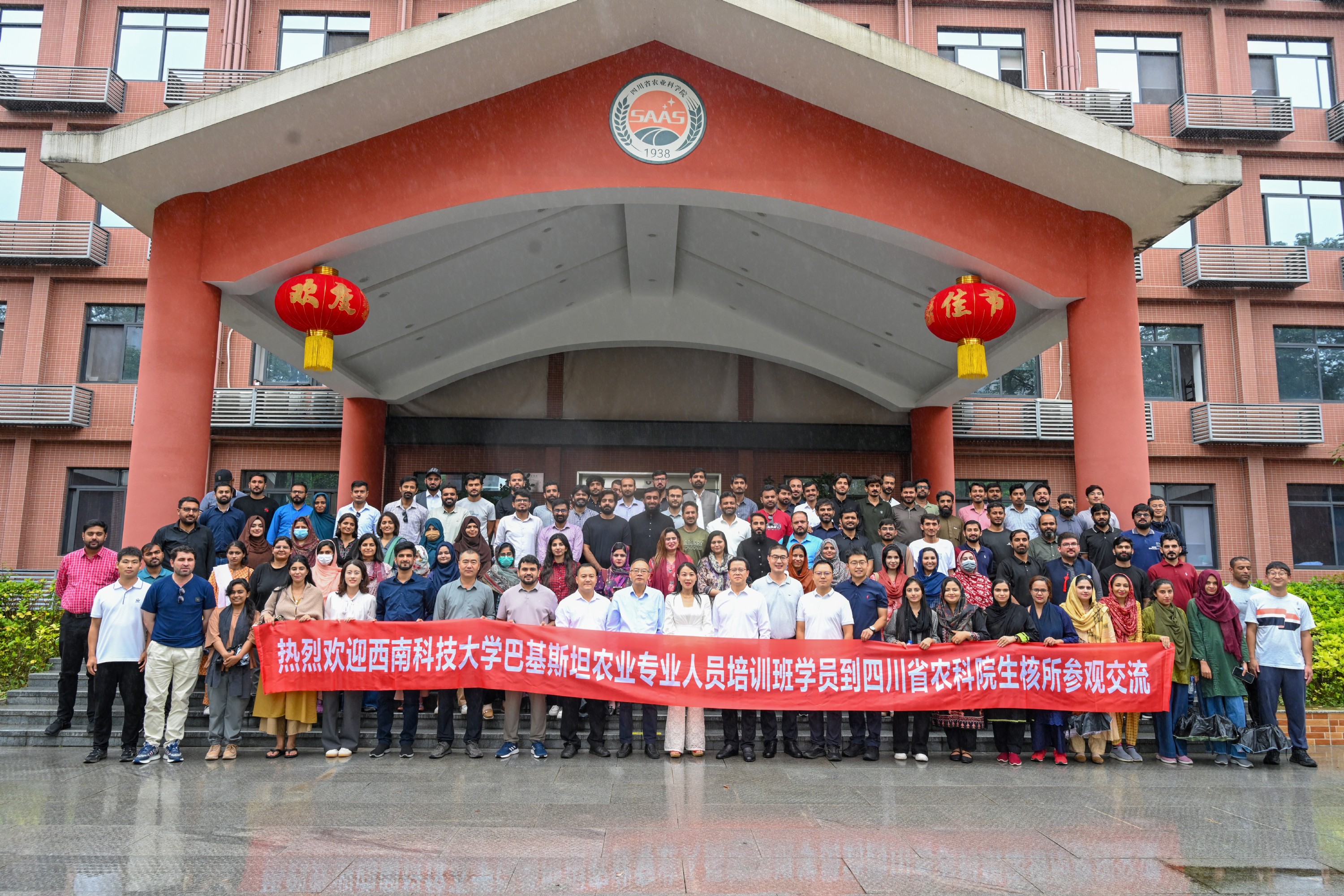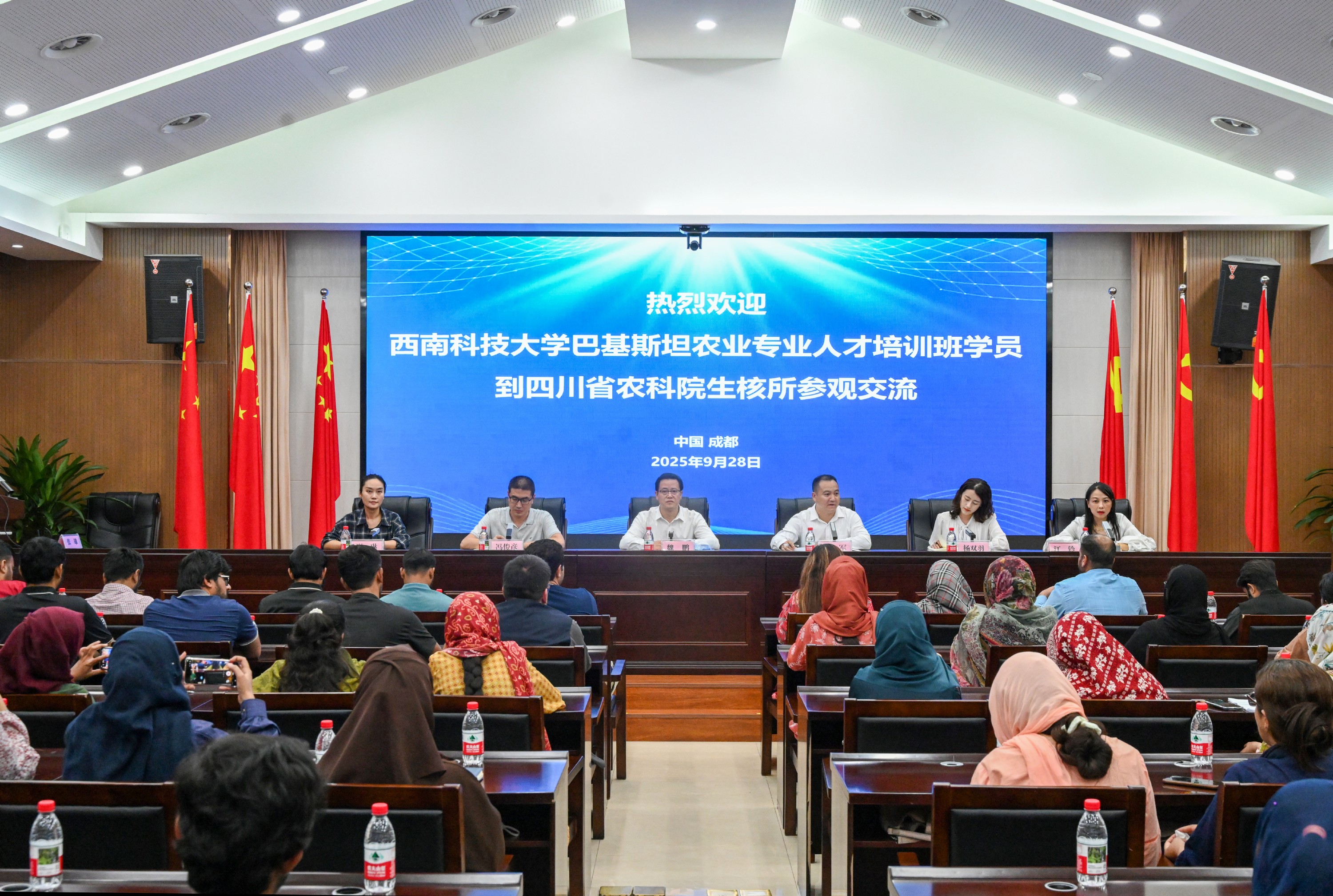 2025年9月28日下午,西南科技大学巴基斯坦农业专业人才培训班100名学员到我院开展参观交流。院党委副书记张雄与部分学员交流并合影留念。院生核所领导班子成员、院科技合作处、西南科技大学及四川农业大学有关同志参加学术交流,院生核所所长宋军主持交流会。