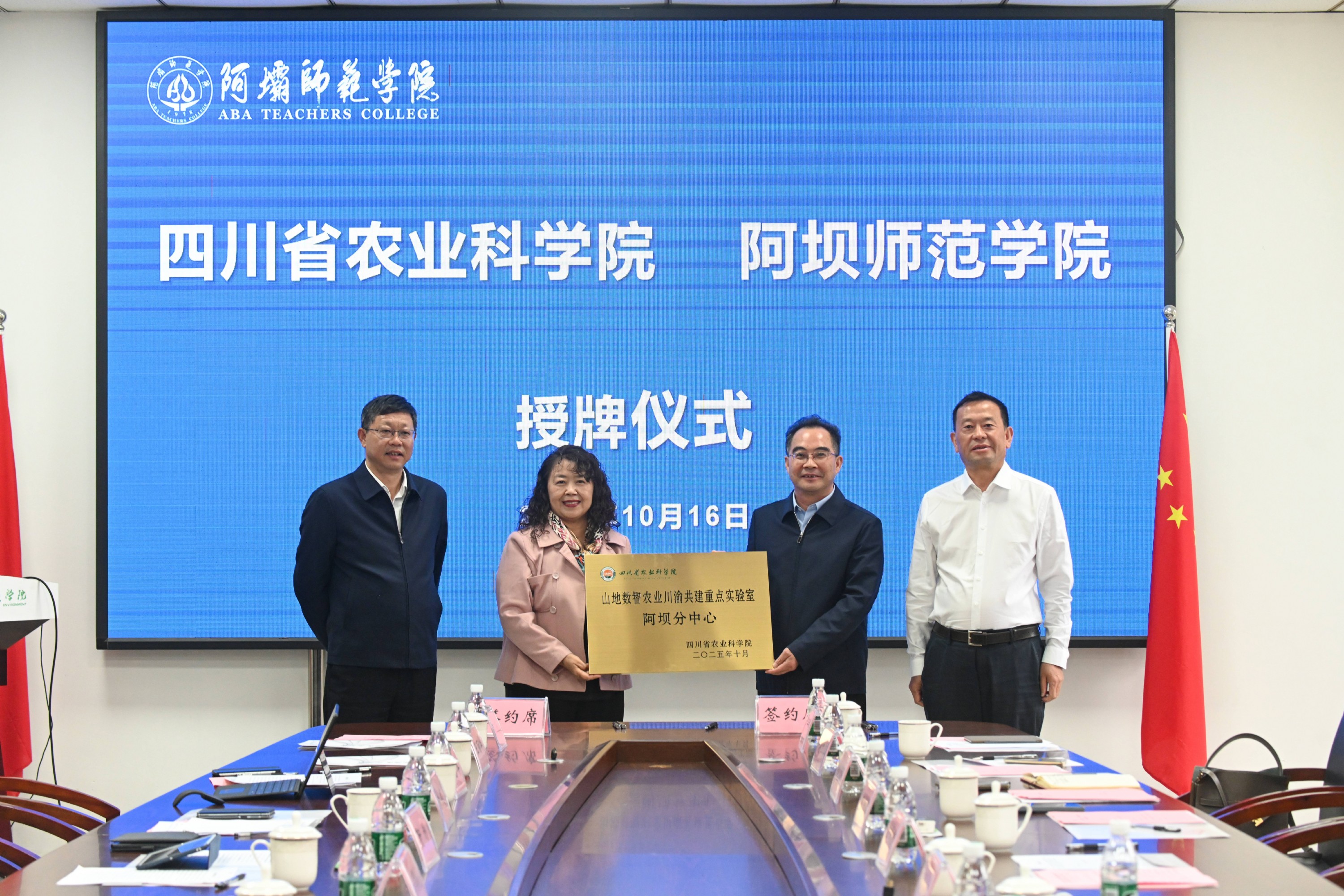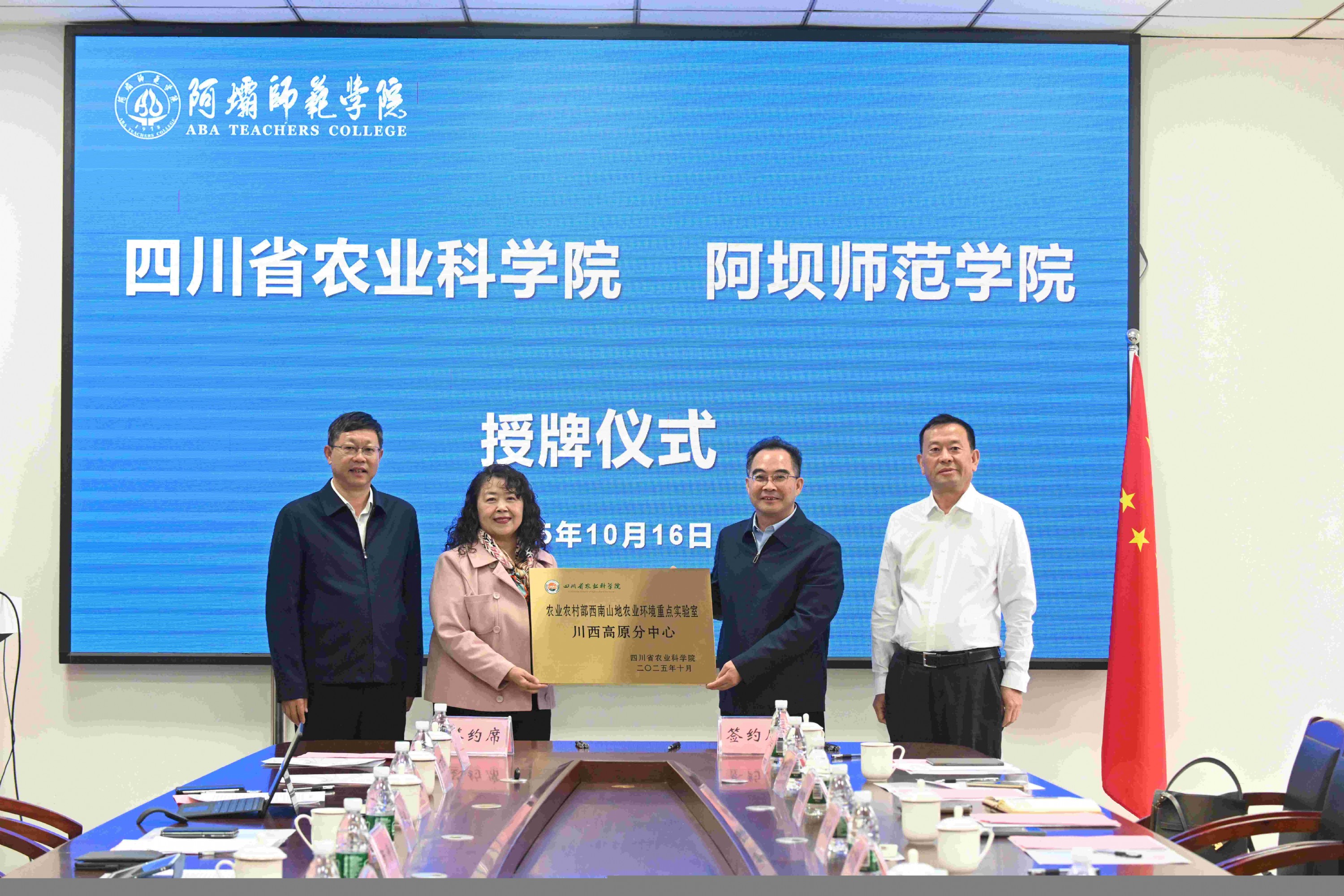 签约仪式上,衡彤书记对牟锦毅书记一行的到访表示热烈欢迎。向武院长在致辞中系统介绍了学校的基本情况、近年学科建设与教学成效等。他表示,双方合作基础良好、前景广阔,对未来的协同发展充满信心与期待。在双方领导见证下,刘永红与马昌威代表两院,共同签署战略合作协议。随后,牟锦毅、刘永红为我院与阿坝师范学院联合共建的“农业农村部西南山地农业环境重点实验室川西高原分中心”“山地数智农业川渝共建重点实验室阿坝分中心”授牌。