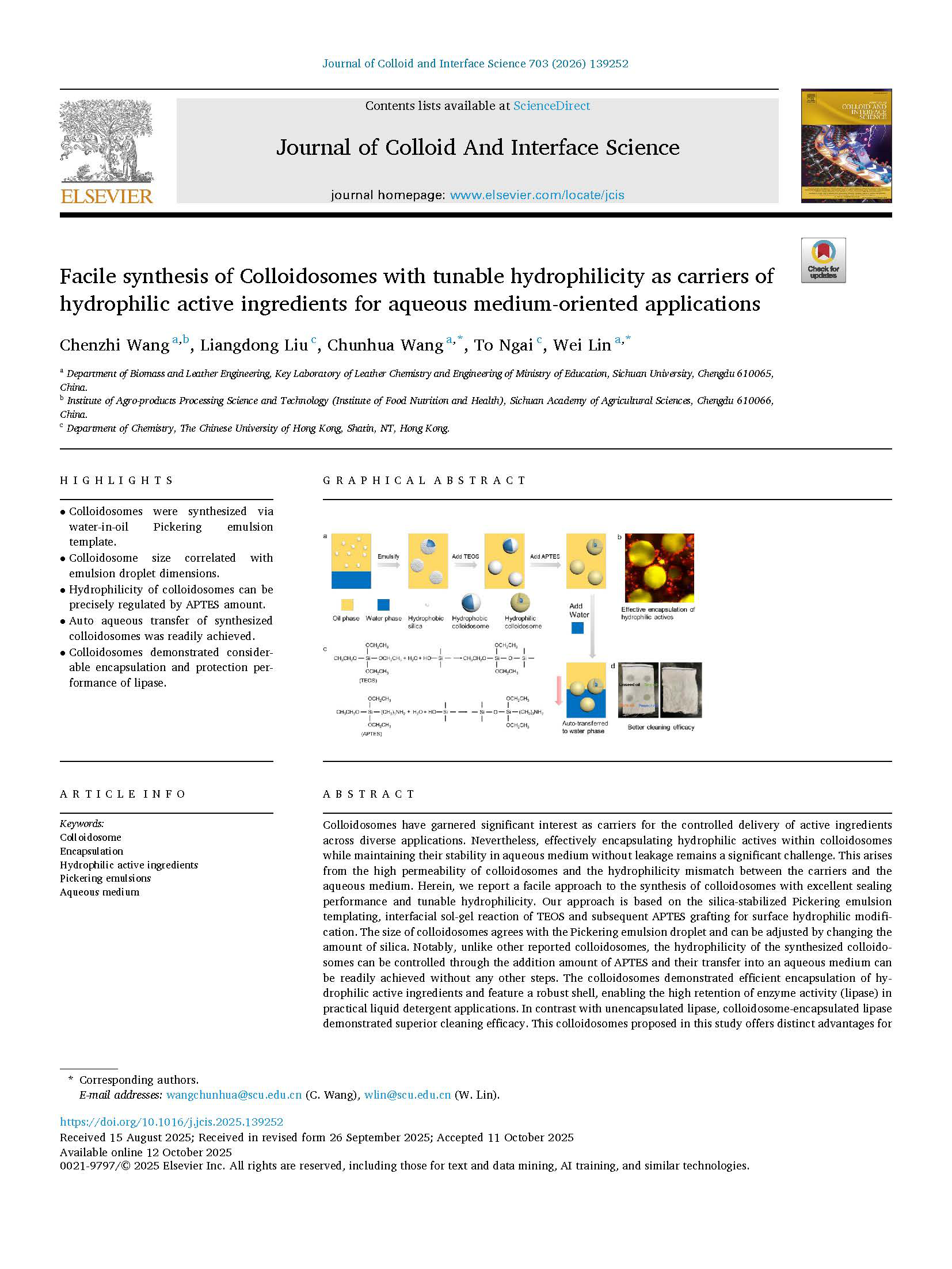 11月04日,四川省农业农村厅发布了2026年度四川省农业主导品种、主推技术和重大引领性技术名单,由院加工所粮油加工研究中心王宸之博士申报的《大豆全组分高值化加工关键技术》入选四川省农业主推技术。该技术立足四川省大豆种质资源,研发了适用于企业生产的全豆豆腐加工工艺与关键技术,开展了技术工艺示范与推广工作;开发出特色化、功能化的全豆豆腐干、全豆豆浆等大豆全组分产品;制定了大豆全组分产品的质量标准,建立了针对全豆制品感官、质地等食用品质的调控技术。实现了大豆全组分的精深加工与高值化利用,推动了健康绿色食品开发,有效助力中小微大豆加工企业提升技术水平与产品效益。目前,该技术已在四川宜宾、德阳等地进行示范推广,助力“南溪豆腐干”等地理标志产品开发高膳食纤维新品。相关成果已授权多项国家专利,并得到国家及省级科技项目资助,为四川大豆产业的高质量发展提供了重要科技支撑。2025年10月12日,该技术相关研究成果在胶体领域顶刊《Journal of Colloid and Interface Science》(中科院一区TOP,IF=9.7)上发表,题为“Facile synthesis of Colloidosomes with tunable hydrophilicity as carriers of hydrophilic active ingredients for aqueous medium-oriented applications”(面向水性介质应用的具有可调节亲水性的胶体囊的快速合成:作为水溶性活性成分的载体)的论文。研究以胶体颗粒稳定的Pickering乳液为模板,实现了胶体囊的快速合成与亲水性精准调控。该方法能够促进蛋白酶等亲水活性成分的高效包封,并提升其在水性介质中的分散性与应用稳定性,从而为植物蛋白胶体体系的构建及相关产品开发提供有效技术支撑。王宸之博士为论文第一作者,研究工作得到了四川省农科院加工所自然科学基金培育项目、四川省农科院人才引进项目、国家现代农业产业技术体系四川大豆创新团队岗位项目以及农业农村部杂粮加工重点实验室开放课题的支持。