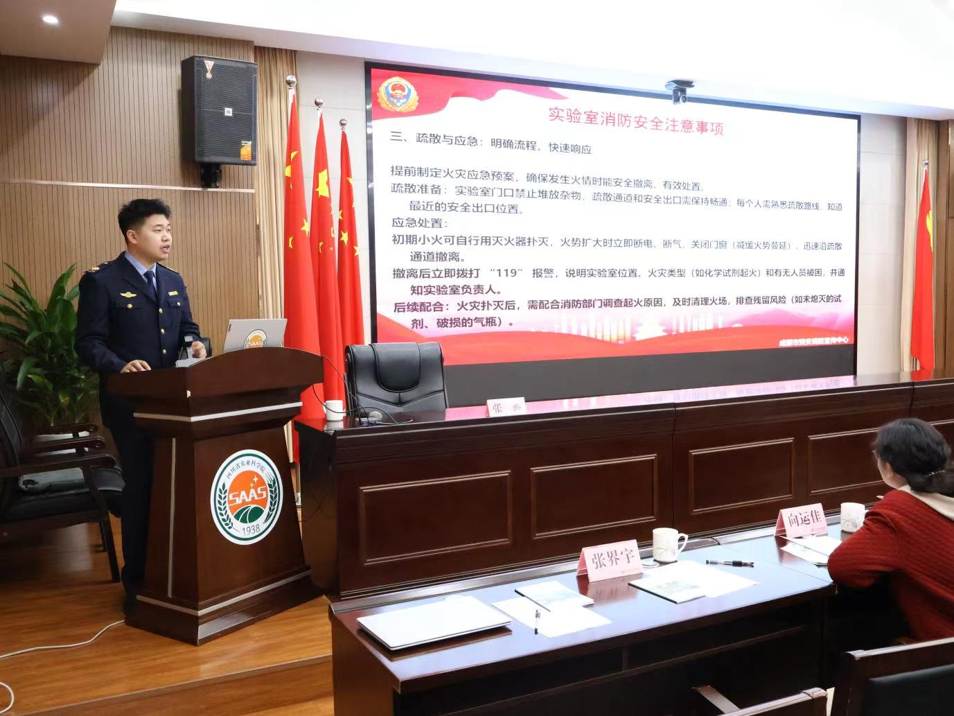 在第34个全国消防日即将来临之际,11月6日,我院在院机关一楼会议厅组织召开了2025年度消防安全和应急能力提升培训会。院党委委员、副院长丁明忠出席会议并讲话。院机关各部门、院属各单位分管负责同志和具体承办工作人员50余人参加培训。会议由院办公室副主任景晓卫主持。