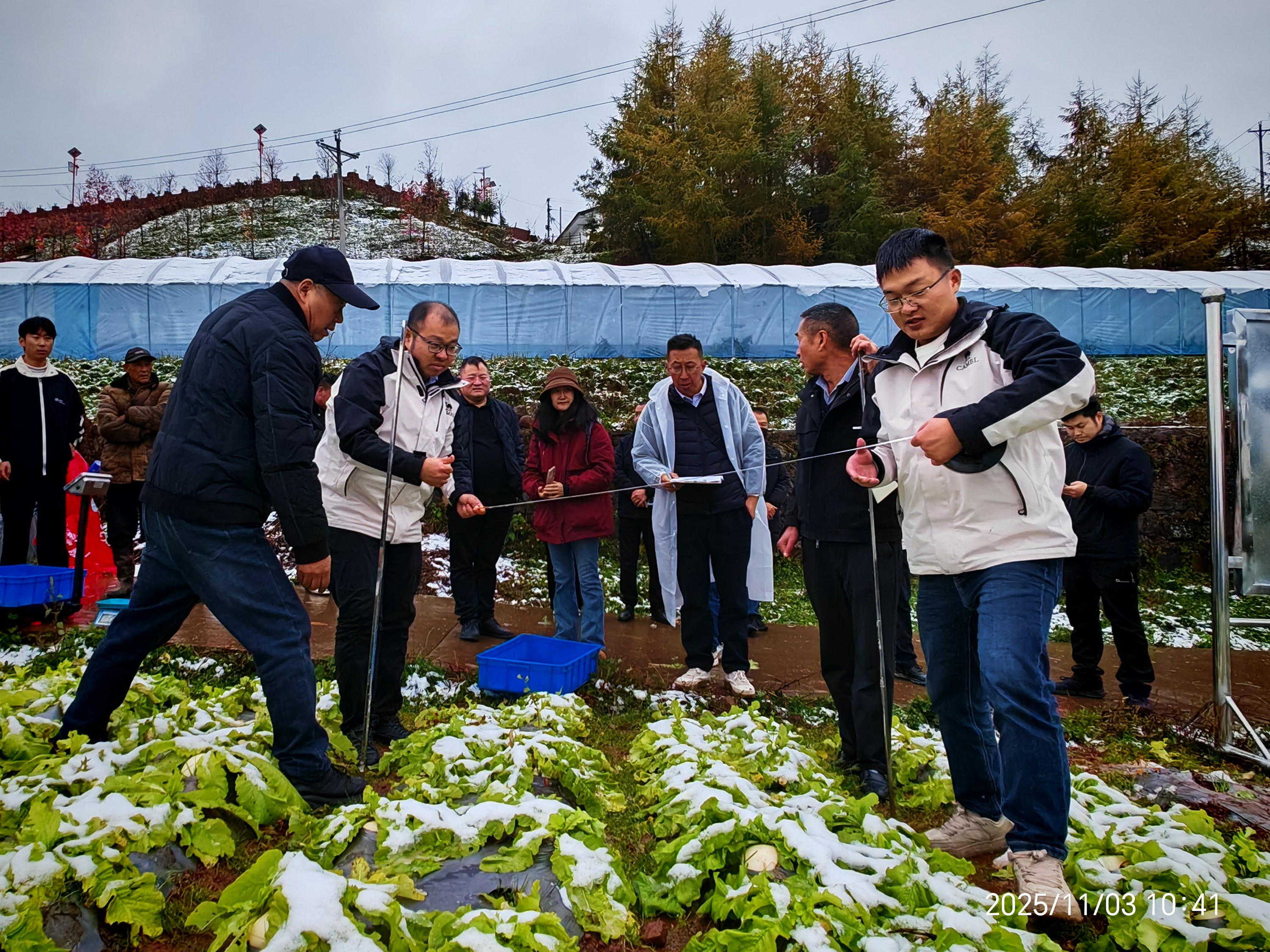 在测产验收中,专家组分别对示范地高产优质杂交萝卜“蜀萝11号”和耐抽薹萝卜新组合“C32009A×C30114”进行了田间长势考察,随机选择了同田3个点进行现场测产,结果显示,“蜀萝11号”和“C32009A×C30114”分别较对照(芜菁)增产134.4%和296.1%,产量增长显著。