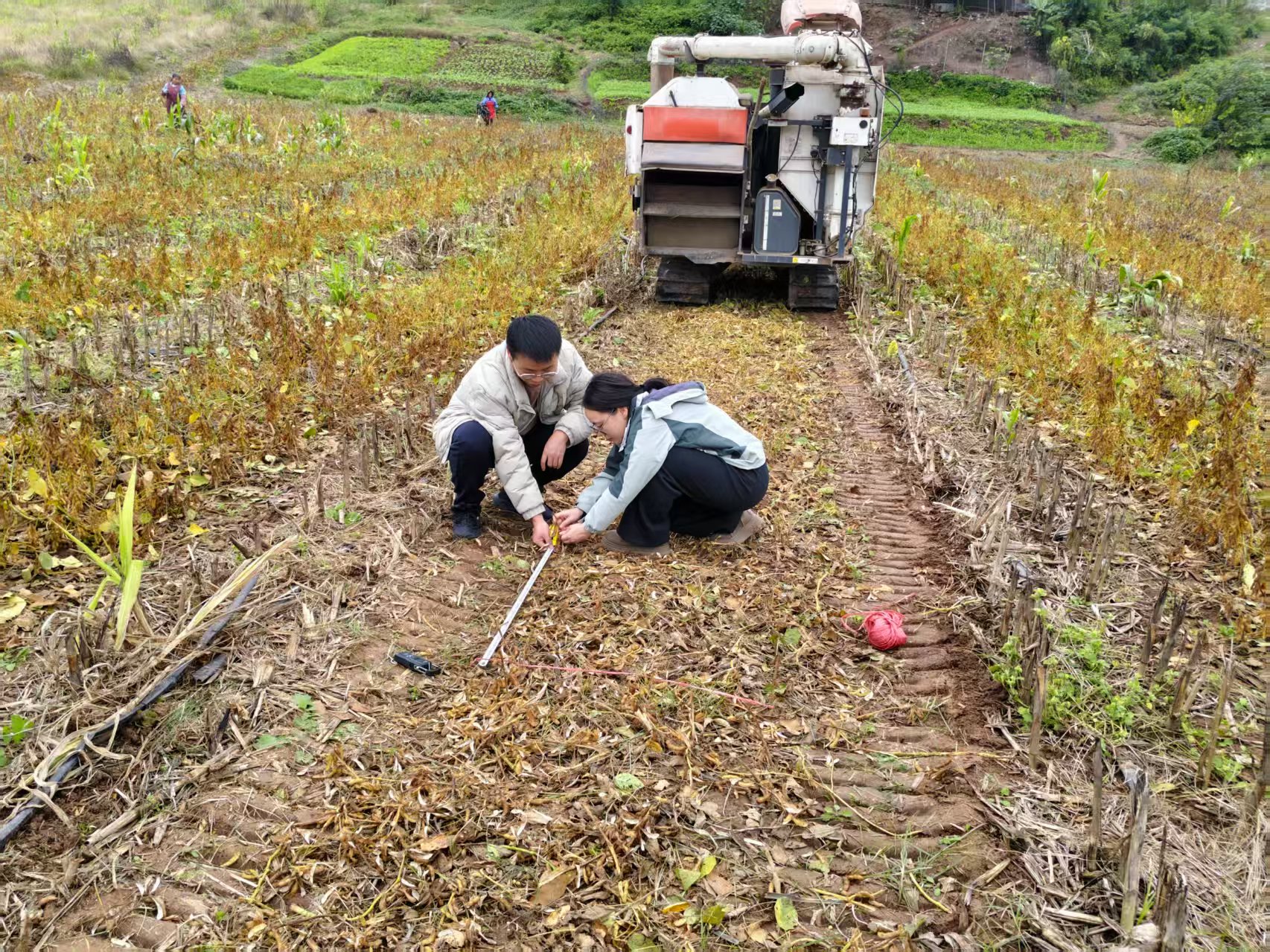 机收减损就是促增产。为提高大豆机械化收获水平,降低大豆机械化联合收获损伤率,实施好四川省揭榜挂帅“耐荫早熟宜机高产大豆新品种选育”项目,2025年11月12日-13日,杂粮机械化研究岗位团队、四川省农机院高级工程师程方平、农艺师罗俊、唐欢等一行人在南充市西充县开展大豆机收作业试验示范,并参加了揭榜挂帅项目选育新品种的测产现场会。