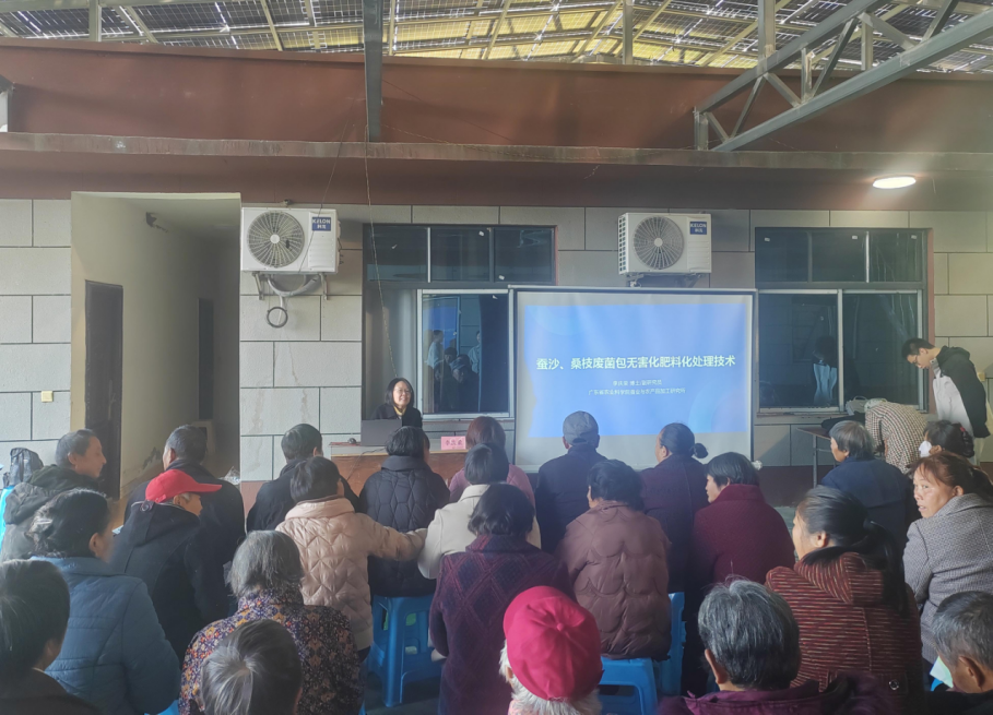 培训会特邀广东省农业科学院蚕业与农产品加工研究所李庆荣副研究员作《蚕沙、桑枝废菌包无害化堆肥处理技术》专题培训,系统剖析了当前蚕区在蚕沙、废弃菌包处理方面面临的堆积现状与潜在环境风险,重点讲解了无害化堆肥的核心技术环节与操作规范,阐明了生物有机肥的优良特性与应用价值。培训现场同步发放技术手册50余份,为参训人员提供了直观实用的操作指南。