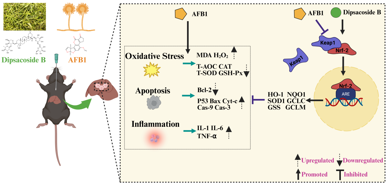 省畜科院兽药研究团队研究了山银花中主要活性成分——川续断皂苷乙(DB)对AFB1诱导的小鼠肝损伤的保护作用及其机制。研究发现,DB能显著缓解AFB1引起的小鼠体重下降和肝脏系数异常,改善肝功能指标和肝脏组织病理变化。进一步机制研究表明,DB通过激活Nrf2信号通路,增强肝脏抗氧化能力,抑制炎症反应,调节I相和II相代谢酶活性,减轻线粒体损伤,并抑制线粒体途径的细胞凋亡。