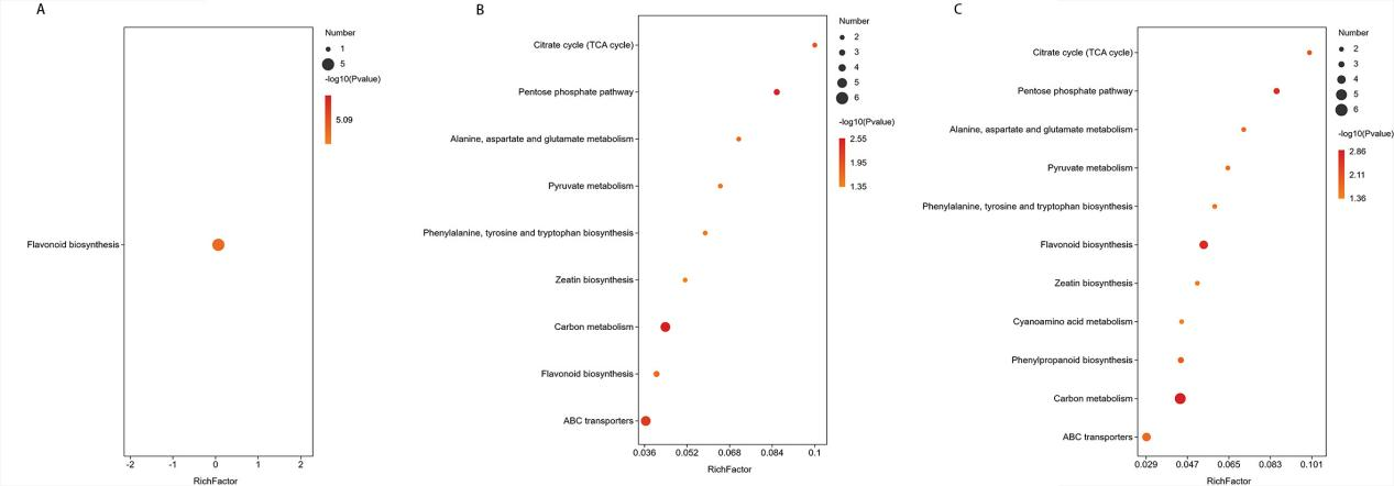 该研究团队以易发生早期落叶的‘翠冠’梨为材料,通过人工去叶处理模拟提前落叶,并利用LC-MS/MS非靶向代谢组学技术,系统分析了花芽在落叶后7、14和21天的代谢物变化。研究共注释到1533个代谢物,发现大多数代谢物在落叶后呈下调趋势。进一步分析表明,落叶诱导的花芽萌发伴随着糖类、氨基酸和次生代谢物的剧烈重组:糖类(如蔗糖、山梨醇)和TCA循环关键中间产物(如苹果酸、富马酸)含量下降,导致能量供应不足;尽管苯丙氨酸合成增强,但其下游具有抗氧化功能的类黄酮和酚酸类物质却显著减少,削弱了花芽的抗氧化防御能力。