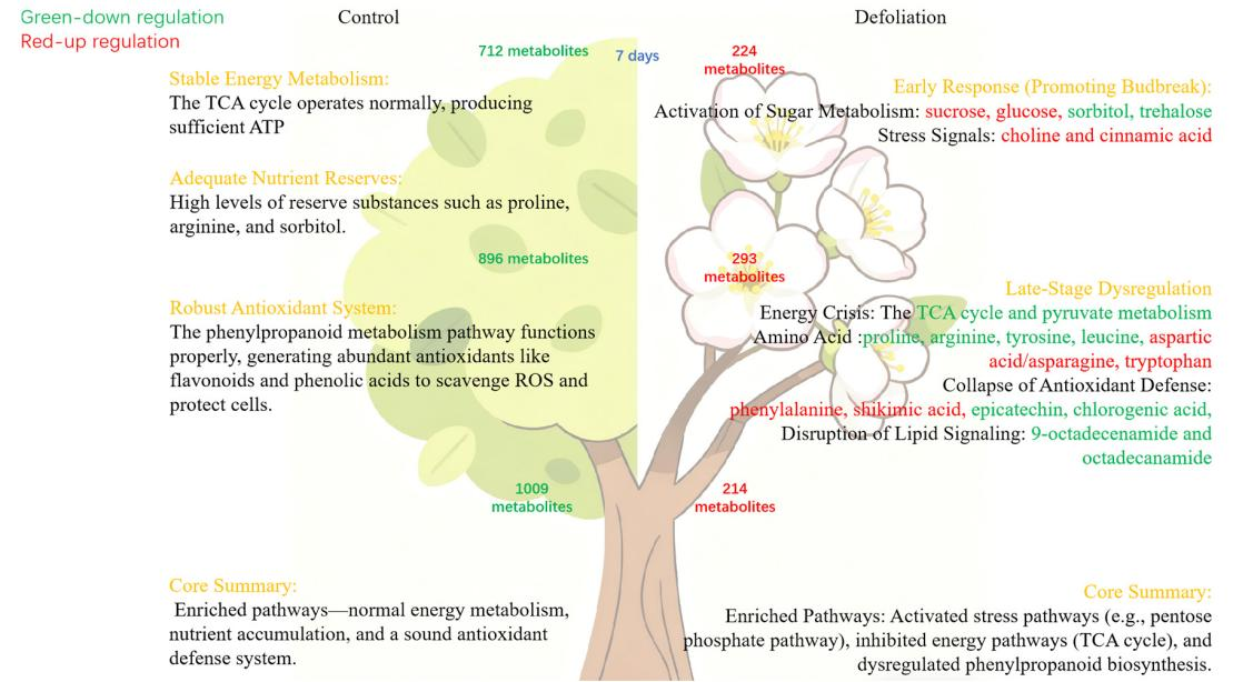 研究首次从代谢层面揭示了提前落叶导致梨树二次开花的生理机制:落叶虽能解除花芽的旁休眠(paradormancy)并促使其萌发,但同时引发了能量代谢紊乱和抗氧化系统功能失调,最终导致花朵数量减少、器官发育不良和早衰。该研究为理解梨树二次开花的成因提供了新的代谢视角,也为制定防控措施和选育抗性品种奠定了理论依据。
