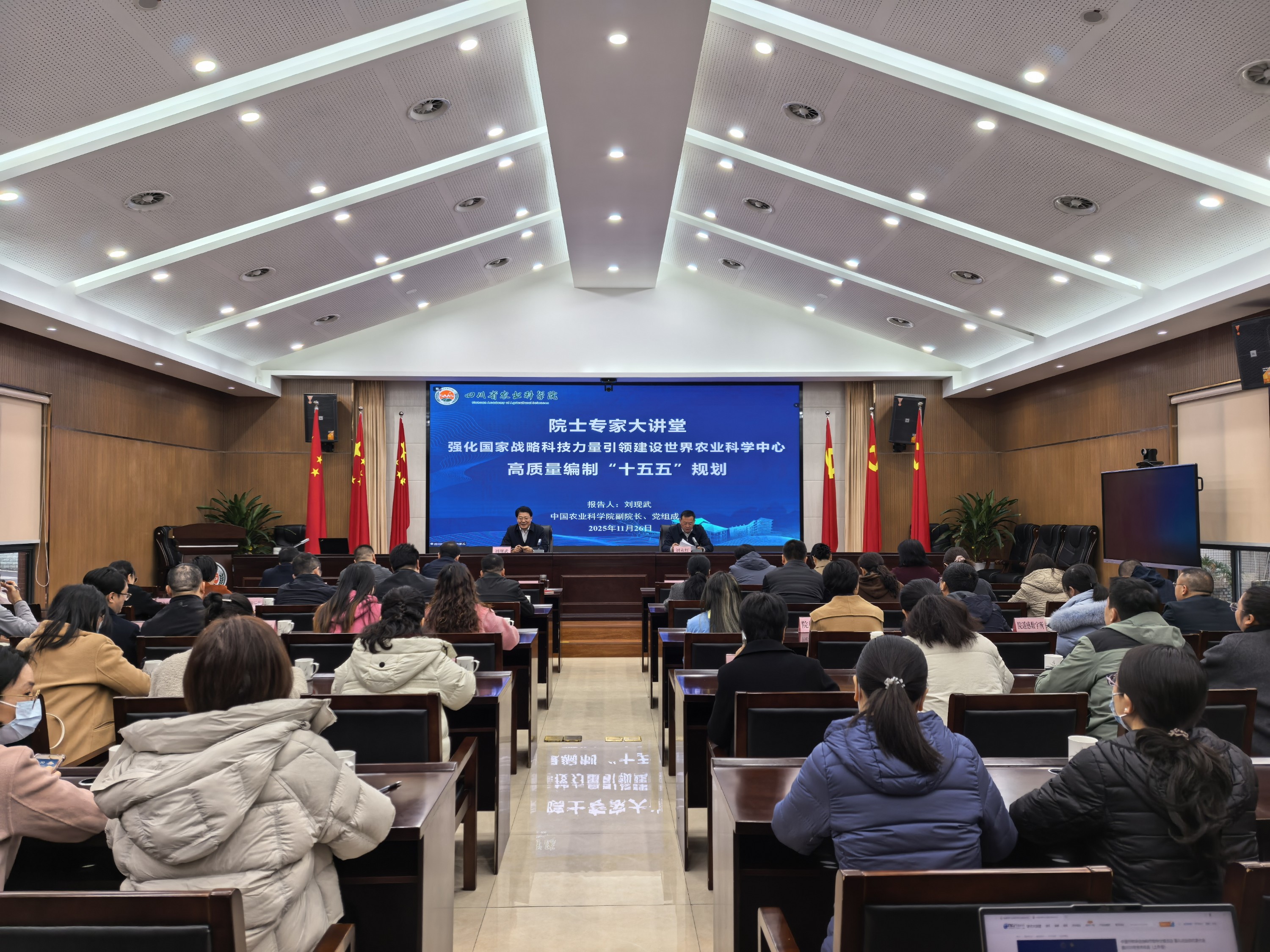 11月26日,中国农业科学院党组成员、副院长刘现武莅临我院,以《强化国家战略科技力量支撑建设世界农业科学中心高质量编制“十五五”规划》为题作专题报告并指导工作。院党委委员、副院长刘永红主持会议,全院80余人在院机关一楼会议厅参加线下会议,100余人通过线上参会。
