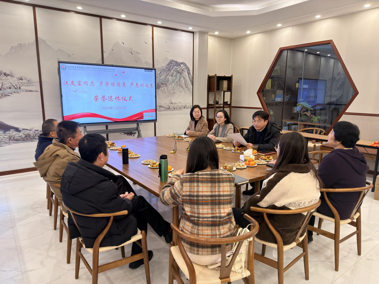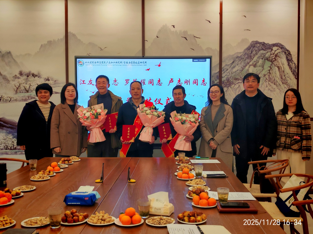 为深入贯彻落实《中共四川省农业科学院委员会关于规范干部职工退休有关工作的实施细则》精神,增强所退休职工的归属感和幸福感增强, 11月28日,院加工所在四合院品鉴室为江友富、罗芳耀、卢志刚三位同志举办荣退休仪式。所党委副书记 所长 李华佳、所党委员 副所长 高佳及相关部门同事参加活动,仪式由所党委委员 副所长 李治华主持。