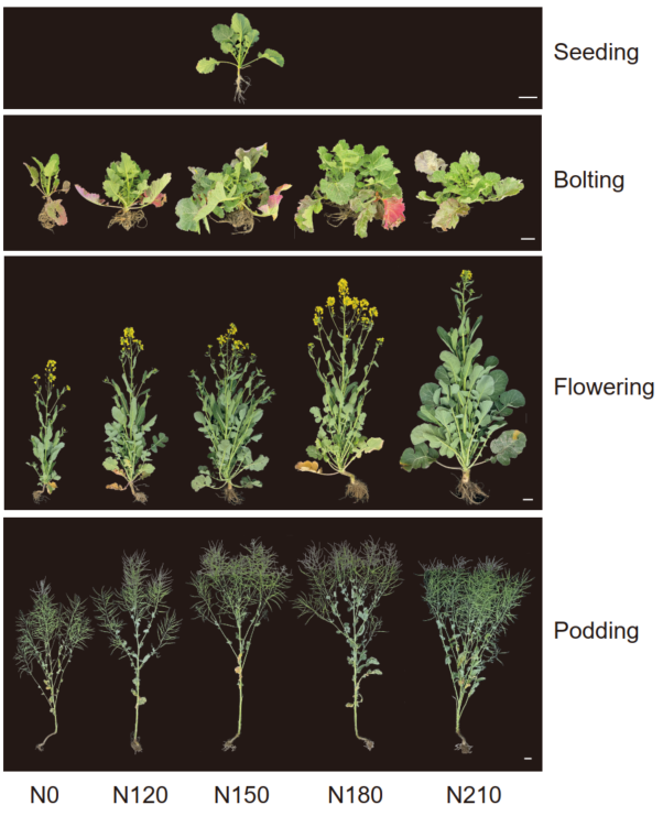 图2. 油菜在不同生育期、各氮肥梯度下植株外形特点