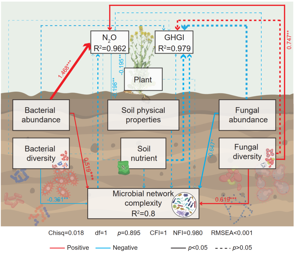 本研究的突破性意义在于首次从微生态视角揭示了减排机制:土壤微生物网络的复杂性是降低温室气体排放强度的关键驱动因子。我们发现,优化施肥能够通过重塑根际真菌群落结构,构建更复杂的微生物共现网络,从而协同实现作物增产与温室气体减排。