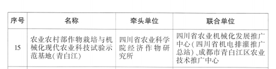 近日,农业农村部办公厅发布《农业农村部办公厅关于设立农业农村部现代农业科技试验示范基地(第一批)的通知》(农办科〔2025〕16号),正式公布第一批农业农村部现代农业科技试验示范基地名单,院经作所牵头申报的“农业农村部作物栽培与机械化现代农业科技示范示范基地(青白江)”获批,合作单位包括四川省农业机械化发展推广中心、成都市青白江区农业技术推广中心,示范基地为院经作所在青白江姚渡镇的坪家光明基地。