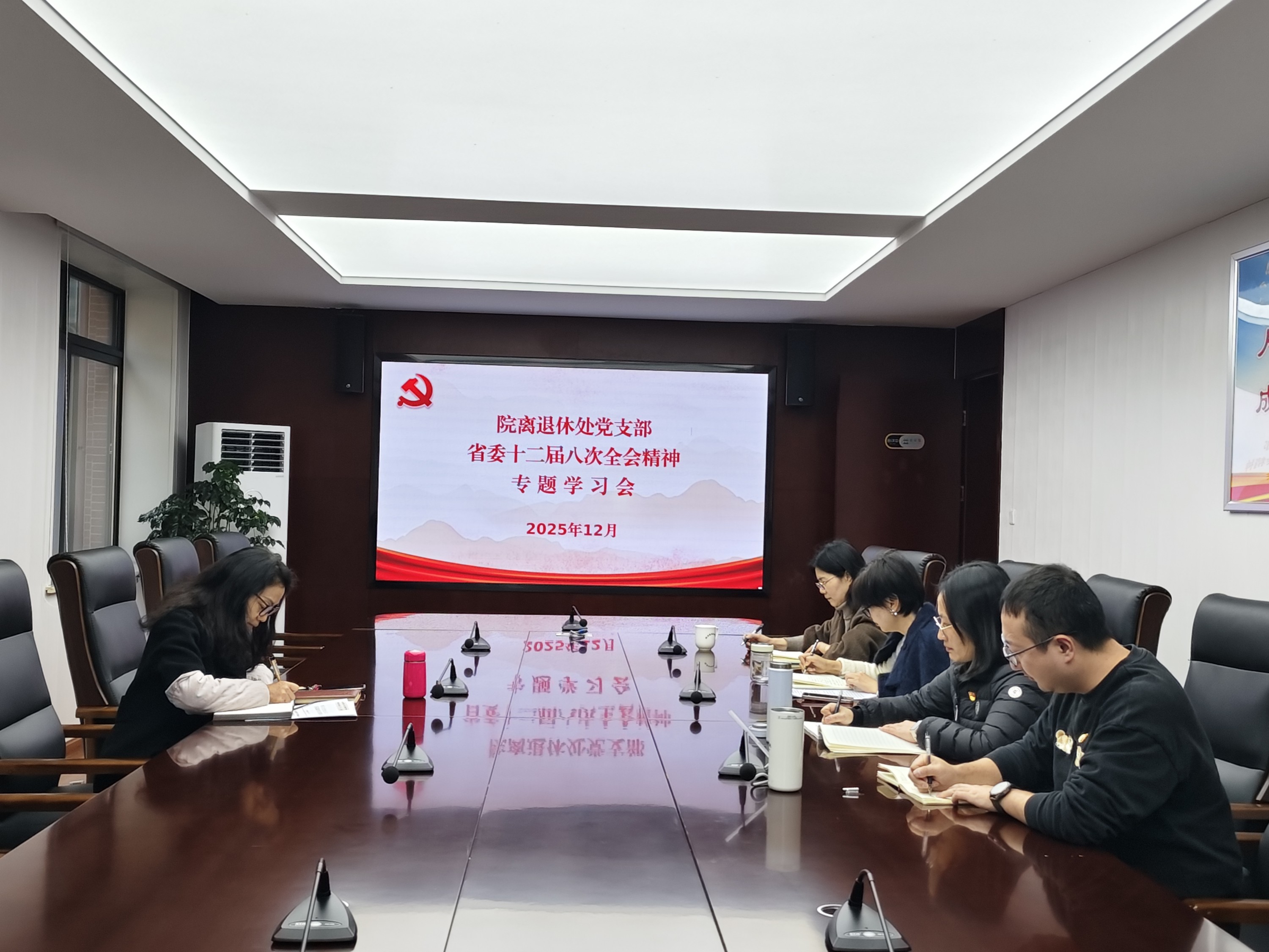 2025年12月5日,院离退休处党支部在院机关二楼会议室召开学习会,专题学习贯彻省委十二届八次全会精神。党支部书记、处长周军主持会议并讲话,全体在蓉党员参加。