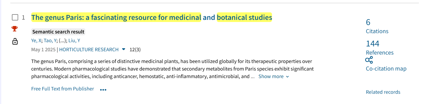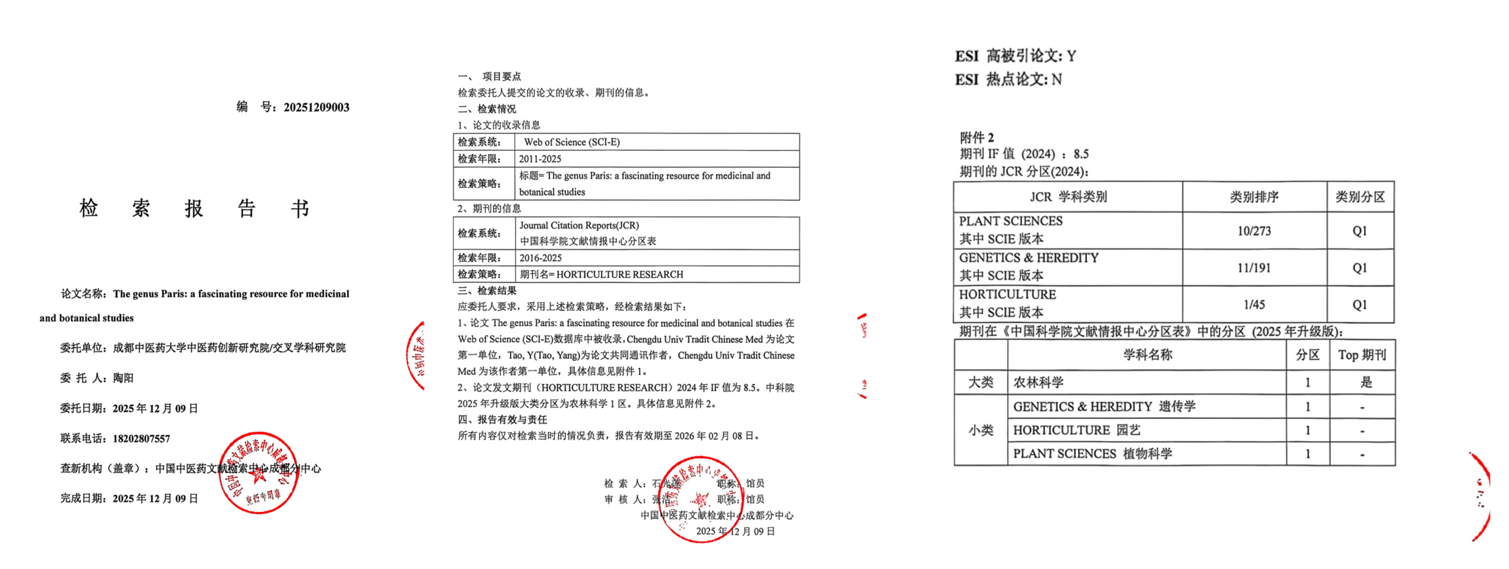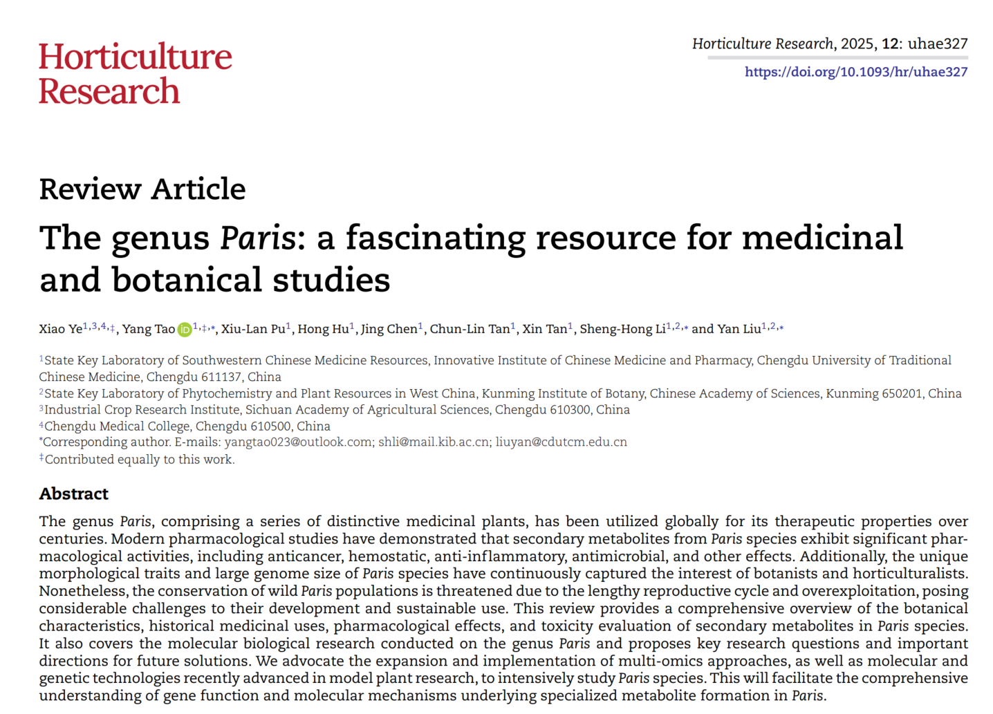 2025年3月,院经作所中药材团队叶霄助理研究员与成都中医药大学药用植物功能物质与生物合成研究团队合作,在国际知名期刊《Horticulture Research》正式发表综述论文“The genus Paris: a fascinating resource for medicinal and botanical studies”(第12卷第3期,文章号 uhae327)。期刊最新发布的2024年JCR影响因子为8.5。近日,该论文入选2025年ESI高被引论文。ESI高被引论文为基于学科与发表年度、进入全球前1%引用表现的代表性成果。