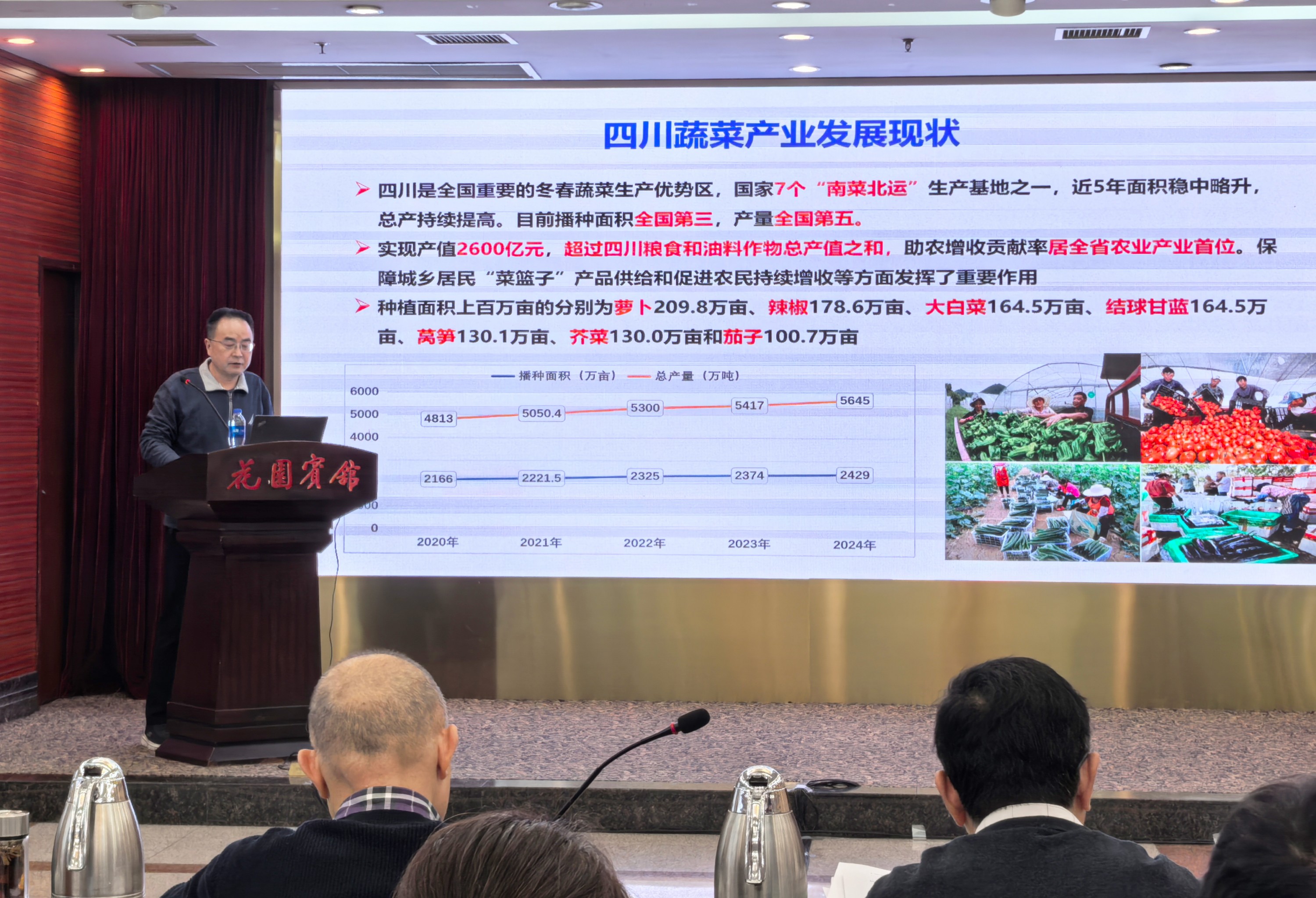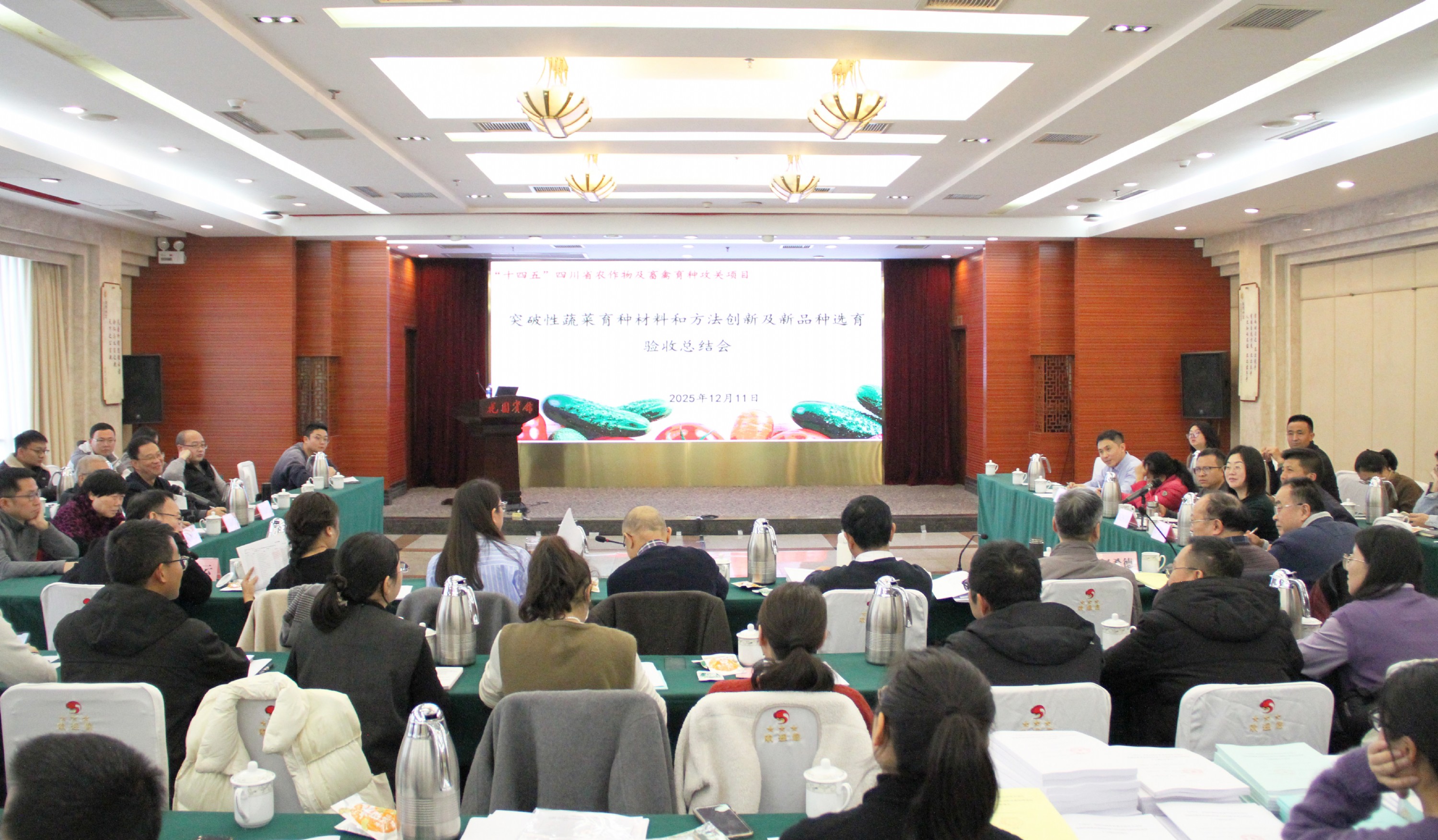 2025年12月11日,四川省“十四五”蔬菜育种攻关项目验收总结暨2025年度工作总结会议在成都召开。会议邀请省农科院李跃建研究员、科技厅信息研究所王敬东研究员、省园艺作物技术推广总站吴传秀研究员、省原子能研究院主任潘琳高级管理会计师、四川大学赵云教授、院科技处何希德研究员等专家组成验收组,对项目各子课题“十四五”进展情况进行考评。院园艺所、作物所、经作所、水稻高粱所和加工所,四川农业大学、成都市农林科学院、攀枝花市农林科学研究院等单位50余名代表参加会议。项目依托单位院园艺所党委书记谢红江到会指导。会议由项目首席专家房超研究员主持。