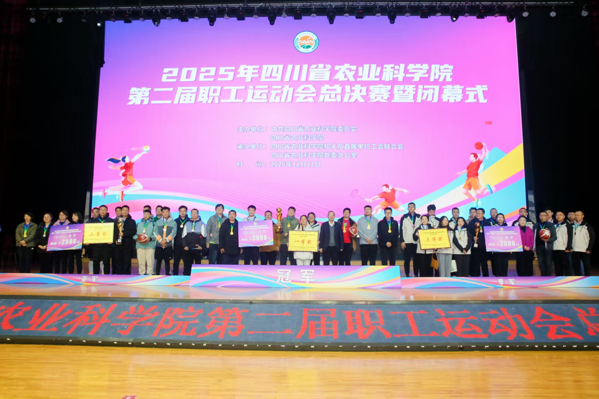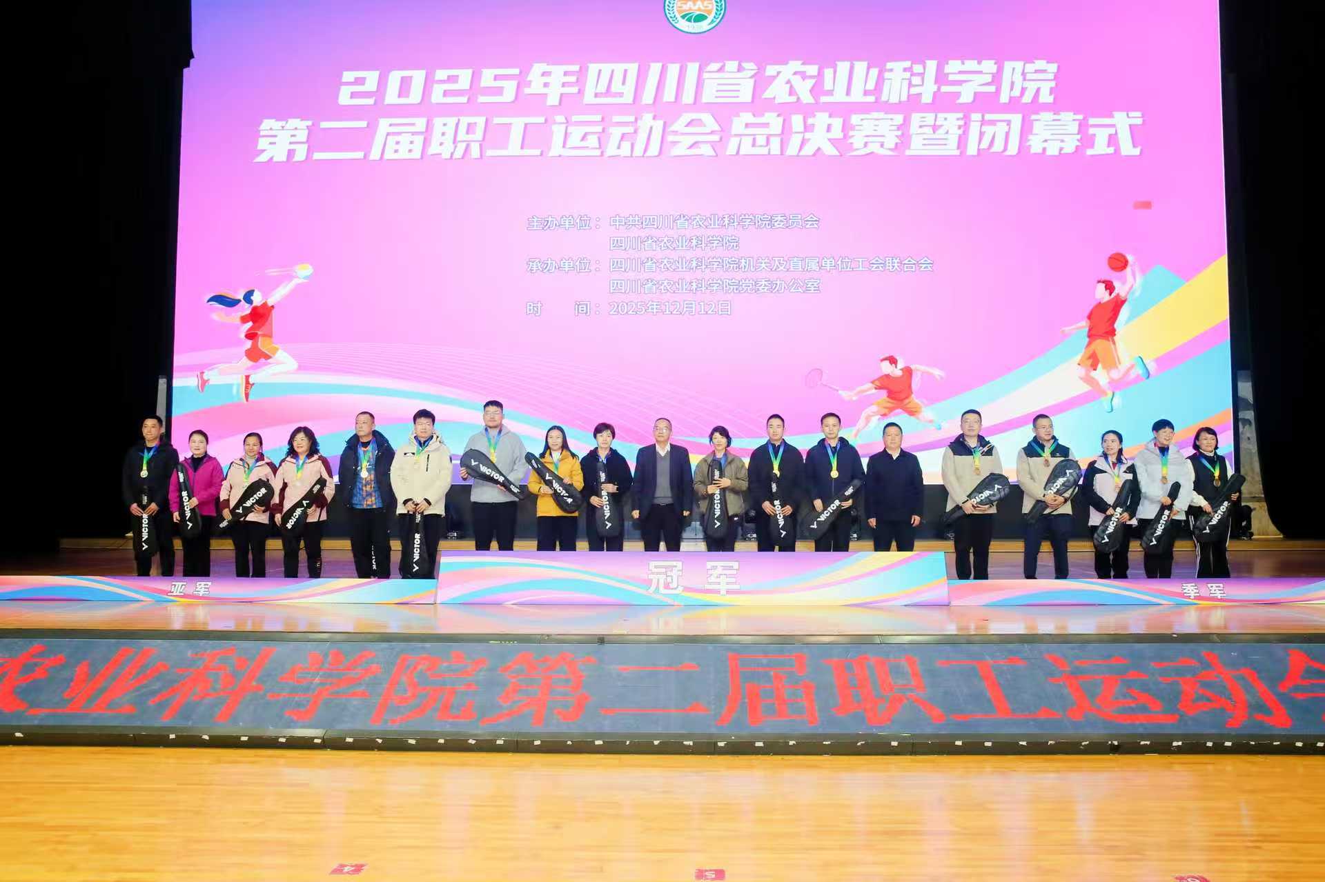 颁奖仪式上,院党委副书记、院机关党委书记、院工会联合会主席张雄为获得优秀组织奖的院园艺所、院生核所颁发了证书;张雄还与院机关党委副书记、院工会联合会常务副主席杜红宇、院党委办主任伍红梅、院机关党委专职副书记彭建华分别为获奖运动员颁发了奖杯、奖牌、证书和奖金,本届职工运动会圆满落幕。