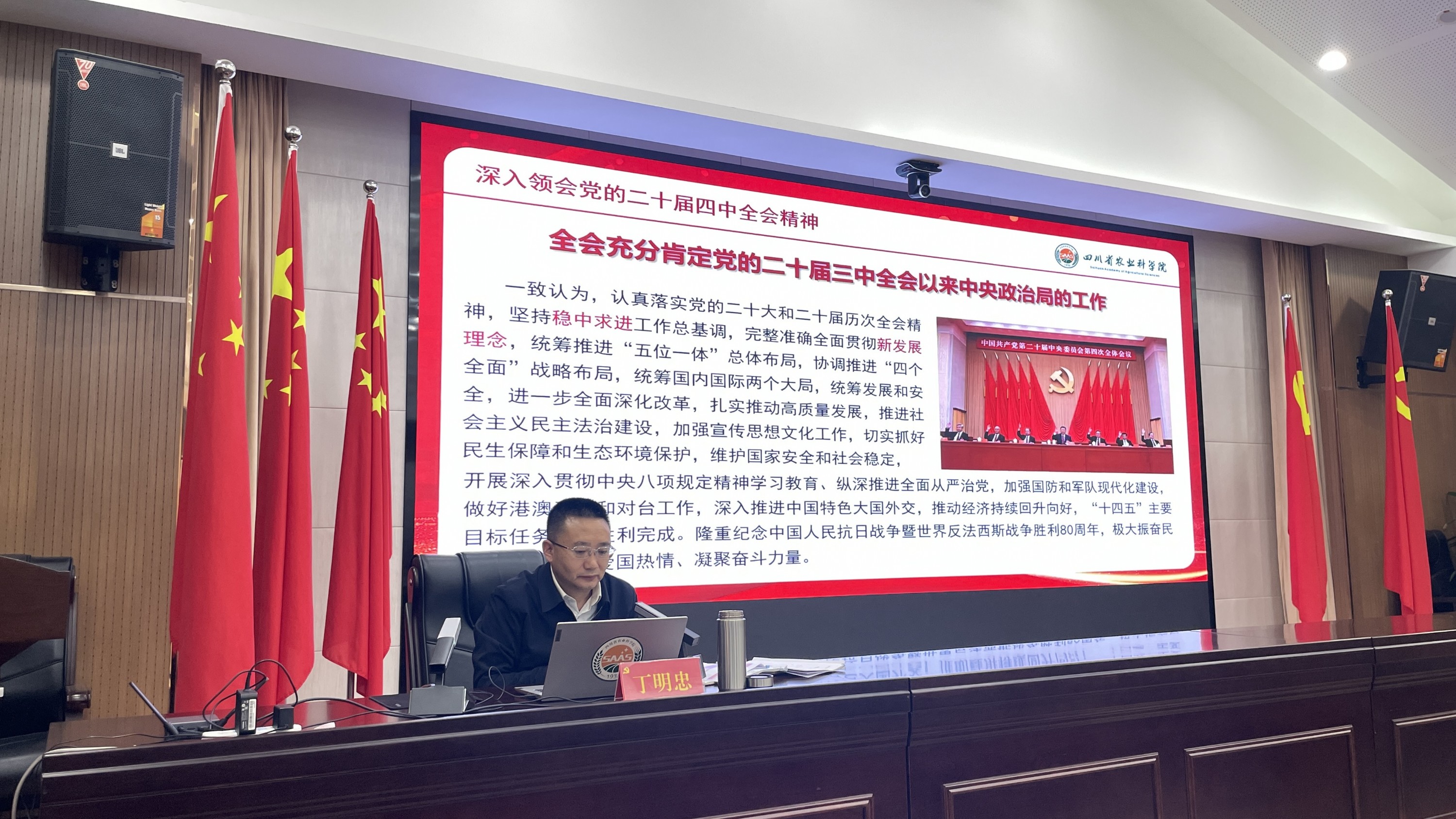 丁明忠副院长从深入领会党的二十届四中全会精神、准确把握省委十二届八次全会精神和全力抓好全会精神的贯彻落实等方面对全会精神进行了系统解读,结合我院实际和分管工作,重点从加快高水平科技自立自强引领发展新质生产力、加快农业农村现代化、扎实推进乡村全面振兴、成渝现代高效特色农业带建设和在新时代打造更高水平的“天府粮仓”等方面进行了分享,并就“十五五”做好科技支撑“川字号”特色产业高质量发展、助农增收、农业园区提档升级等方面进行了新的思考部署。