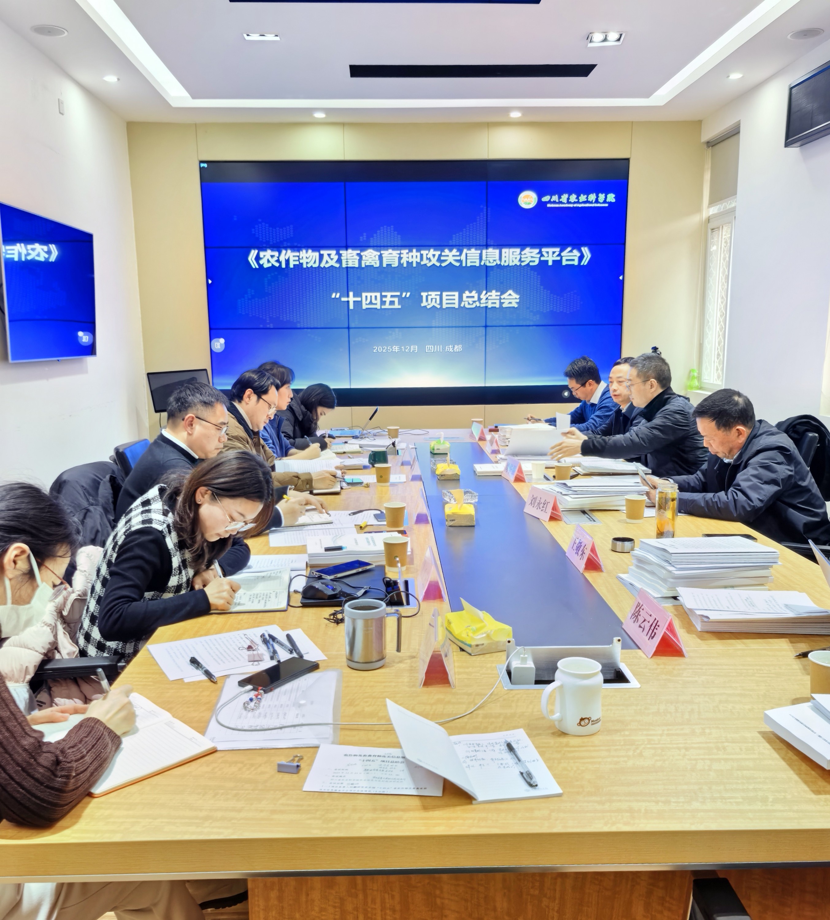 2025年12月23日下午,院信息农经所召开农作物及畜禽育种攻关信息服务平台“十四五”项目总结会。省农科院党委委员、副院长刘永红研究员,省科技信息所党委书记王敬东研究员,省农村中心主任周华强研究员,院条财处处长蒲志刚研究员,中科院成都文献情报中心陈云伟研究员,院科技处副处长蒋俊研究员等专家领导参会。院信息农经所党委书记、项目首席何鹏研究员主持。
